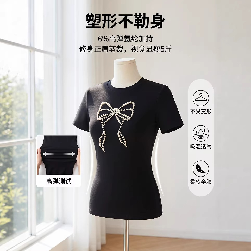 2026新款莫代尔钉珠珍蝴蝶结修身小版短款弹力正肩短袖T恤女夏季