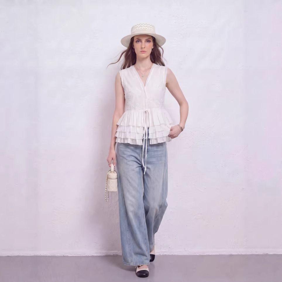 新款100棉重工立体绣花荷叶边系带无袖白色衬衫女上衣夏季薄款