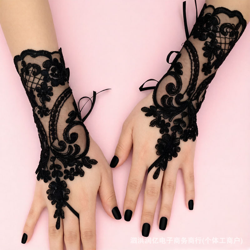 欧美时尚新娘短款露指手套黑色镂空无指网纱手套婚纱礼服配件跨境