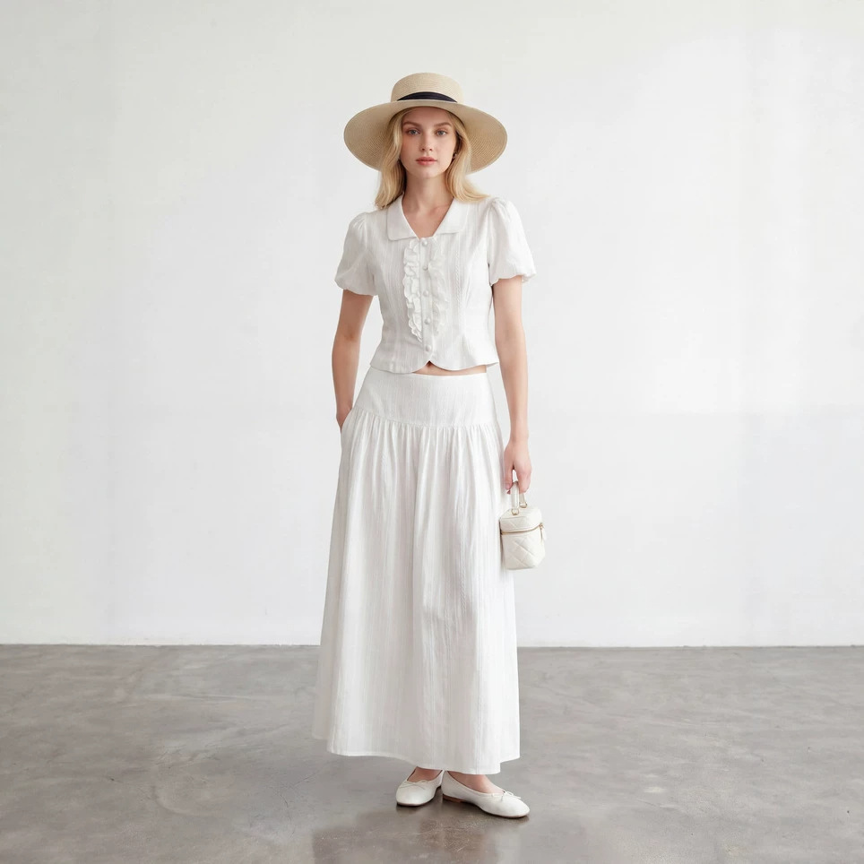 2026新款100棉法式泡泡袖荷叶边短袖白色衬衫女上衣和长裙两件套