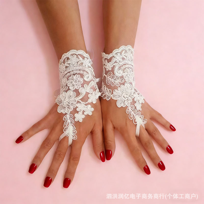 欧美时尚蕾丝白色短款绑带露指手套新娘婚纱礼服婚礼服饰配件跨境