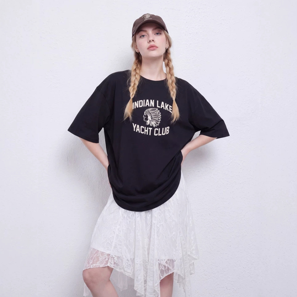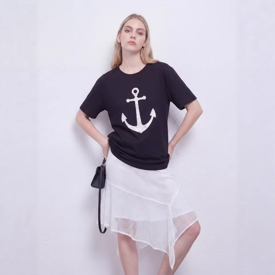 夏季女短袖绣花船锚图案慵懒风松弛感宽松休闲印花短袖T恤女显瘦