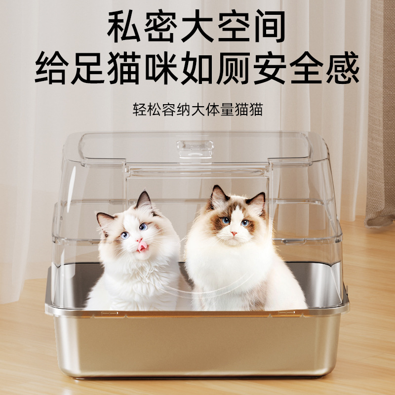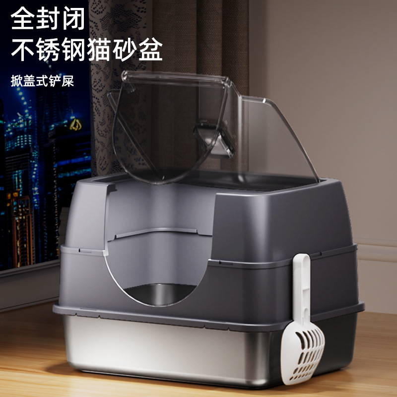 新品不锈钢猫砂盆翻盖全封闭式猫厕所隔臭宠物用品防外溅沙猫屎盆