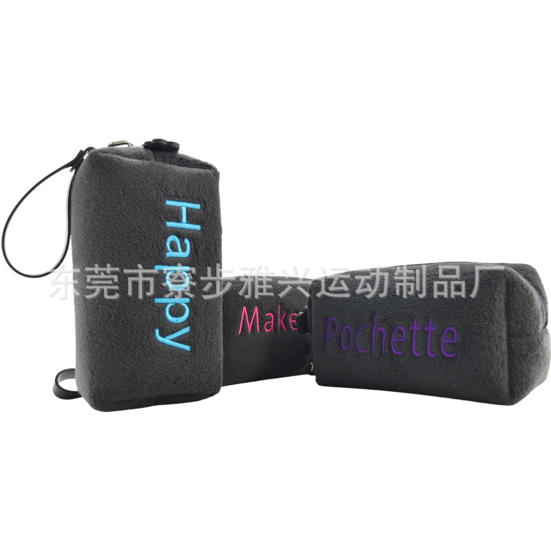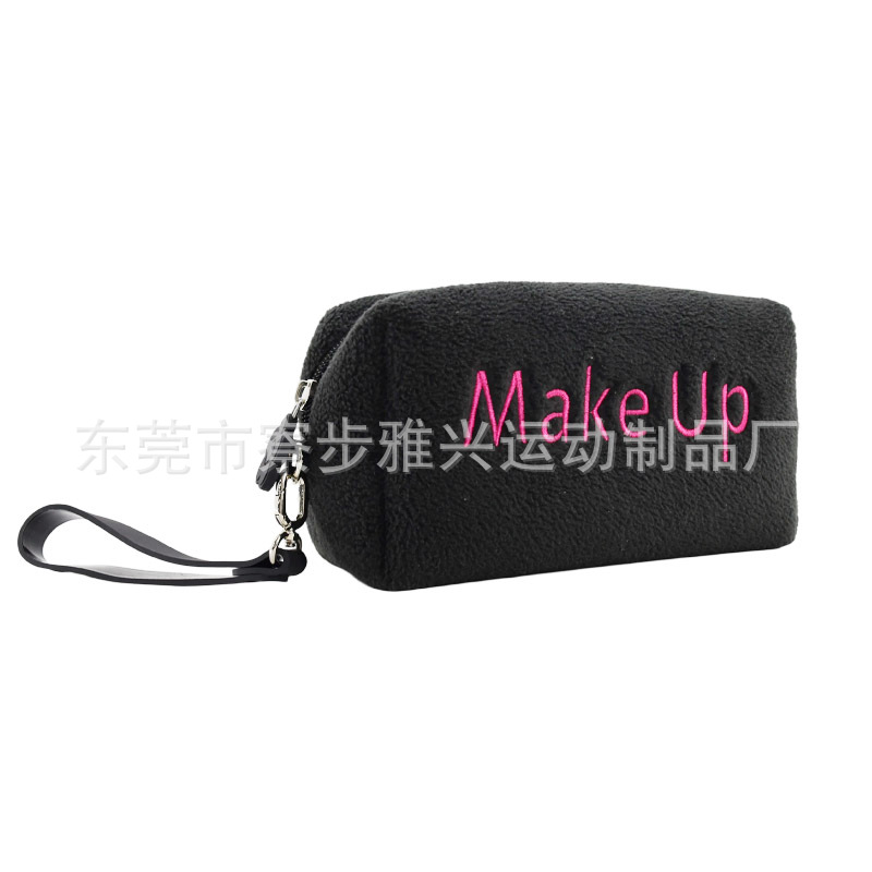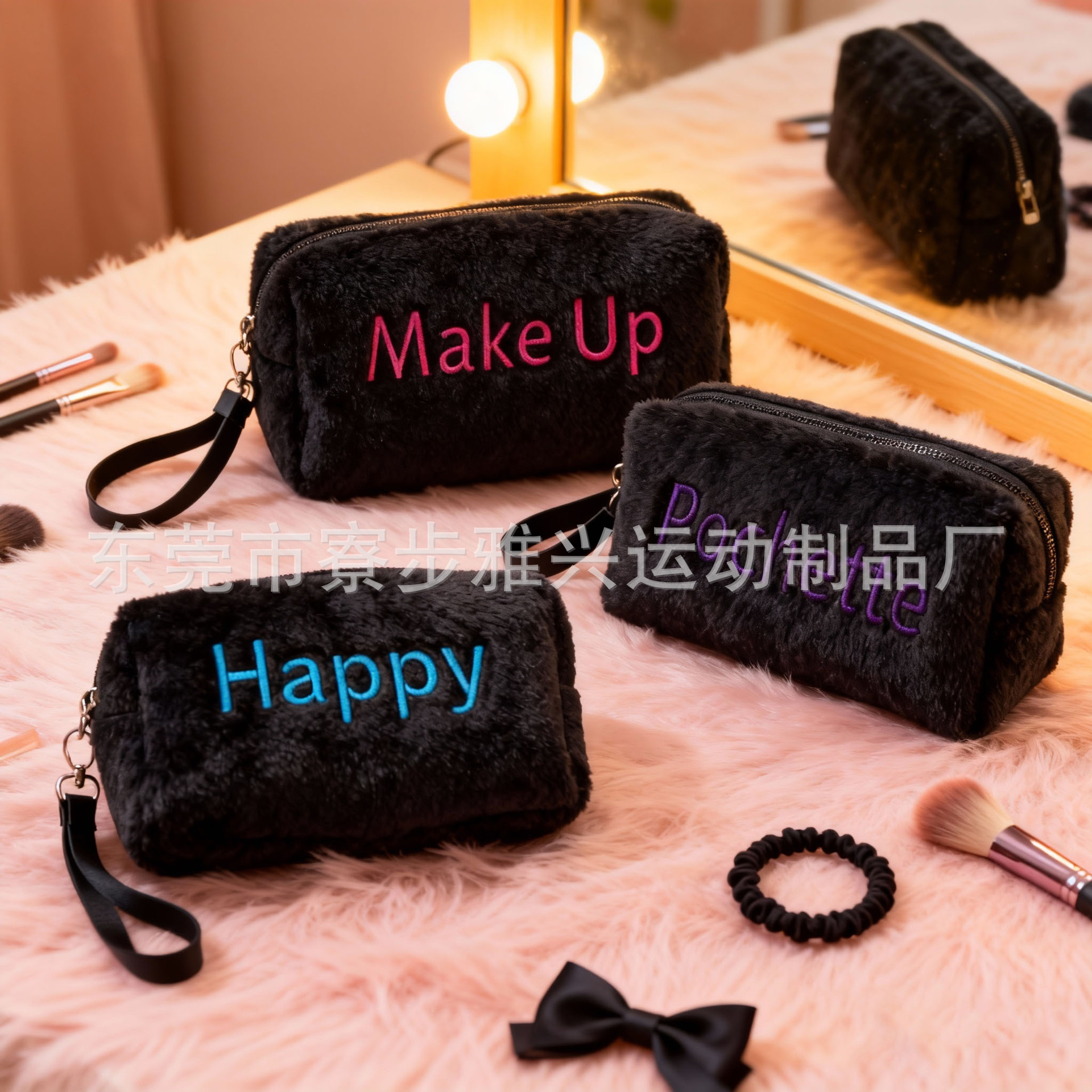 工厂直销定制logo 黑调刺绣毛毛料防水化妆包