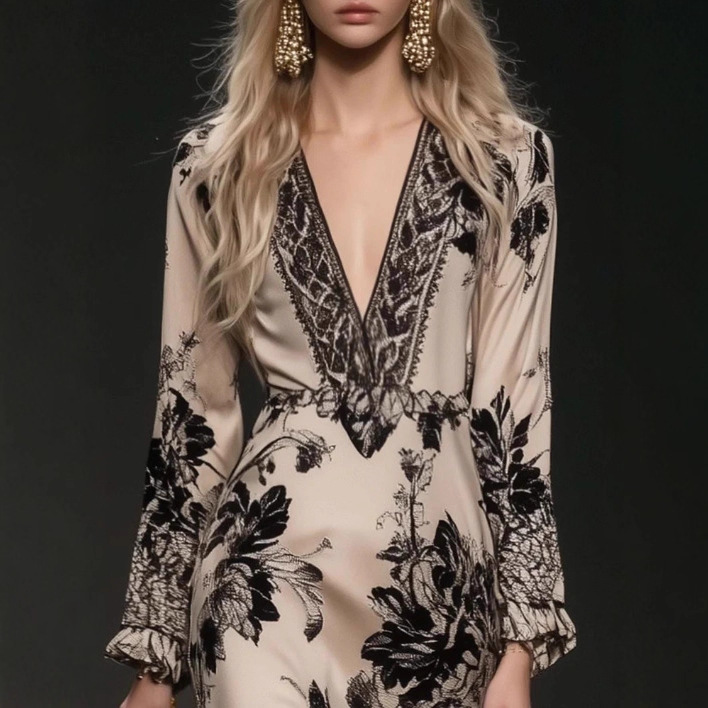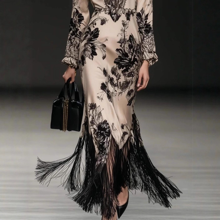 欧美跨境独立站优雅波西米亚风格V领流苏花卉印花米色缎面长裙