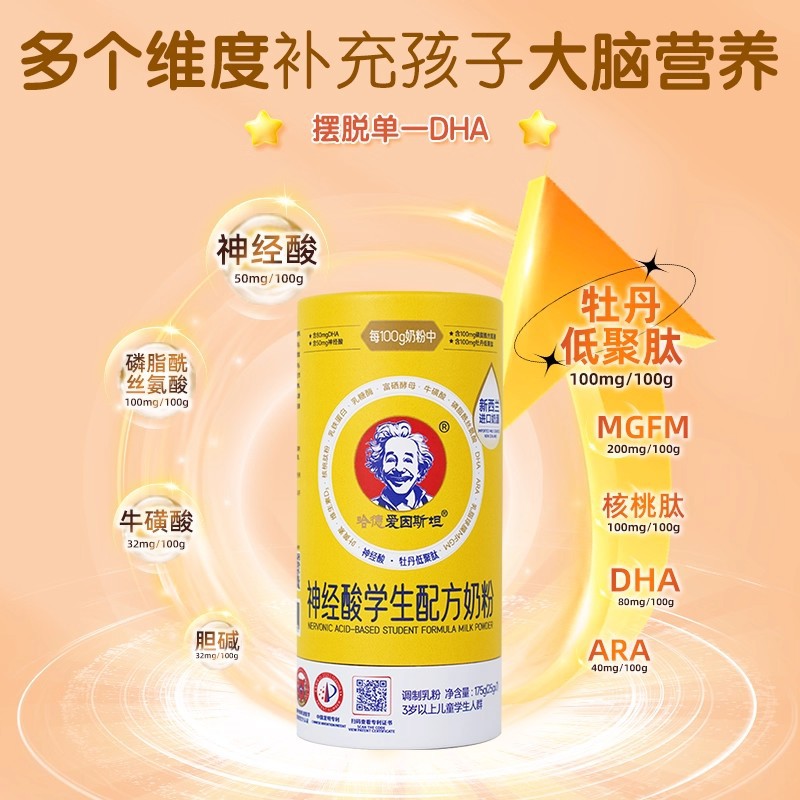 | 适用人群 | 3-15岁 | 主要营养成分 | 神经酸(核心专利成分,旨在修复神经元)、DHA/ARA、磷脂酰丝氨酸(PS)、牛磺酸、胆碱、牡丹肽等 |
