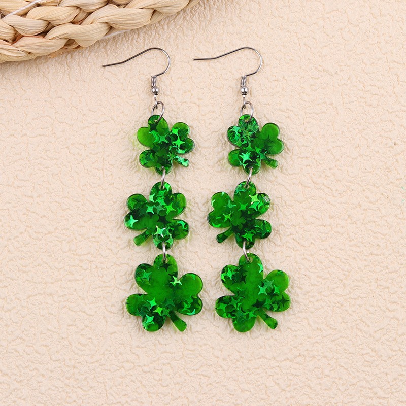 圣帕特里克节狂欢节韩版个性百搭绿色亚克力闪粉幸运四叶草耳钩女