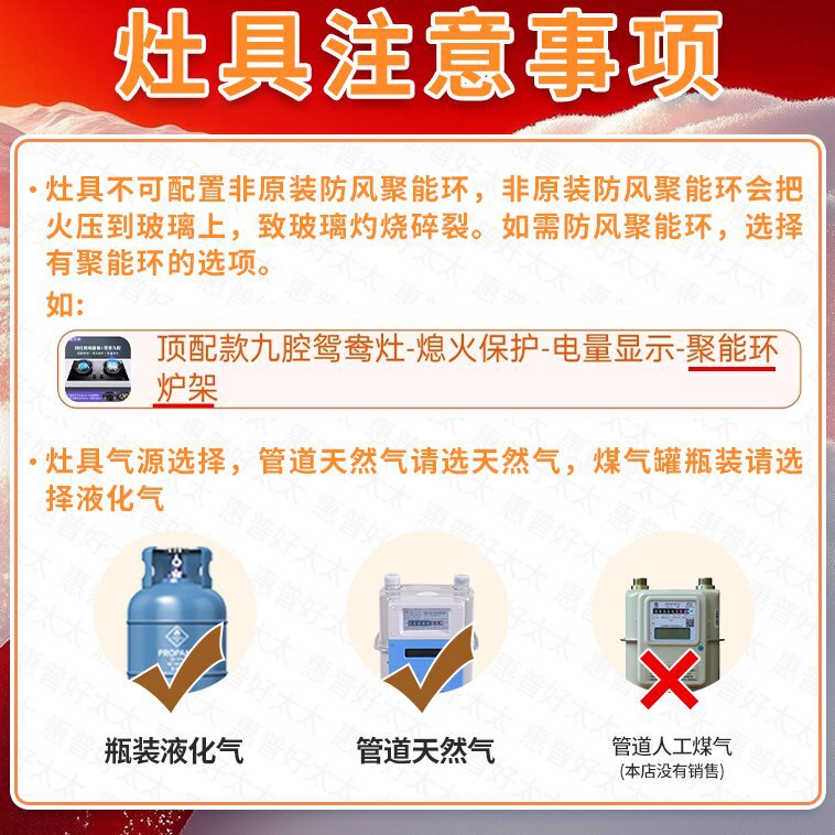 | 颜色 | 豪配款九腔鸳鸯灶-熄火保护+加厚不锈钢 | 颜色 | 顶配九腔鸳鸯灶-熄火保护-电量显示 |