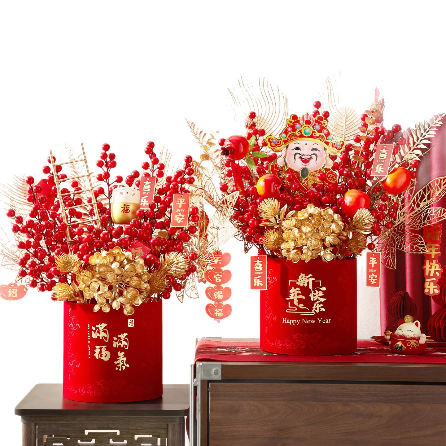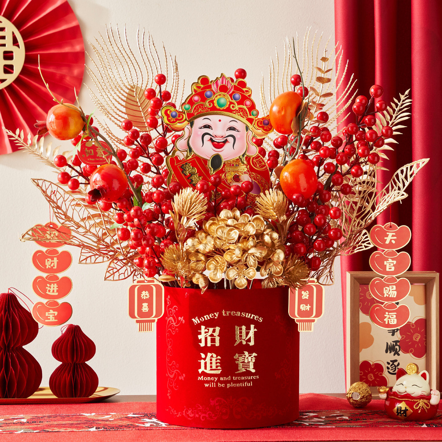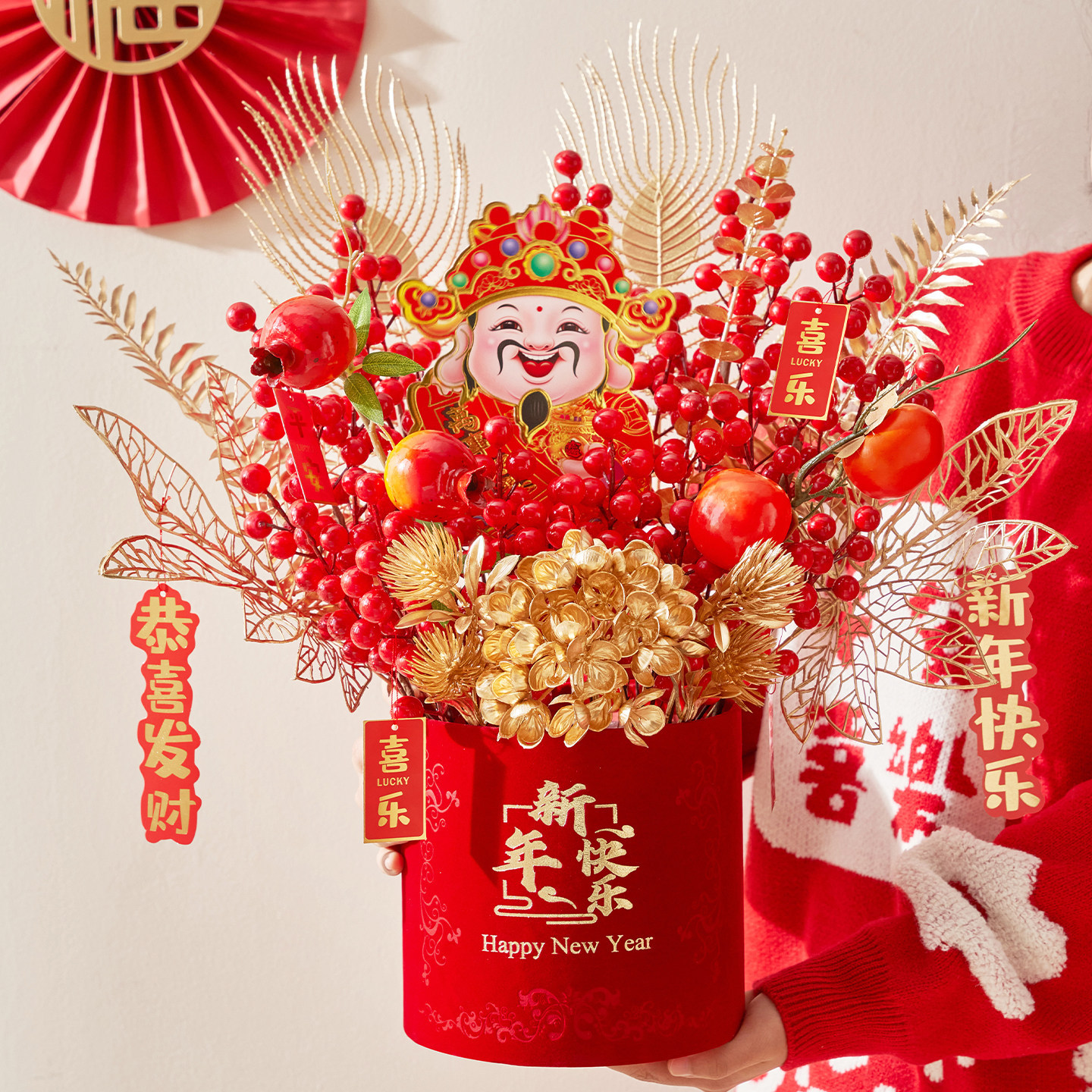 新年福桶仿真花红色招财进宝开业财神爷摆件客厅装饰用品乔迁新居