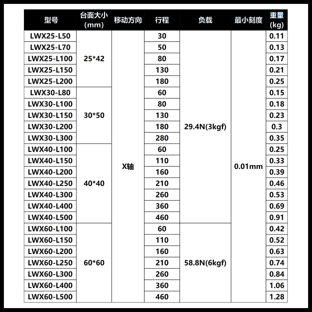 | 滑轨长度 | LWX60-L600-2 | 滑轨长度 | LWX25/40/60滑块一个 |