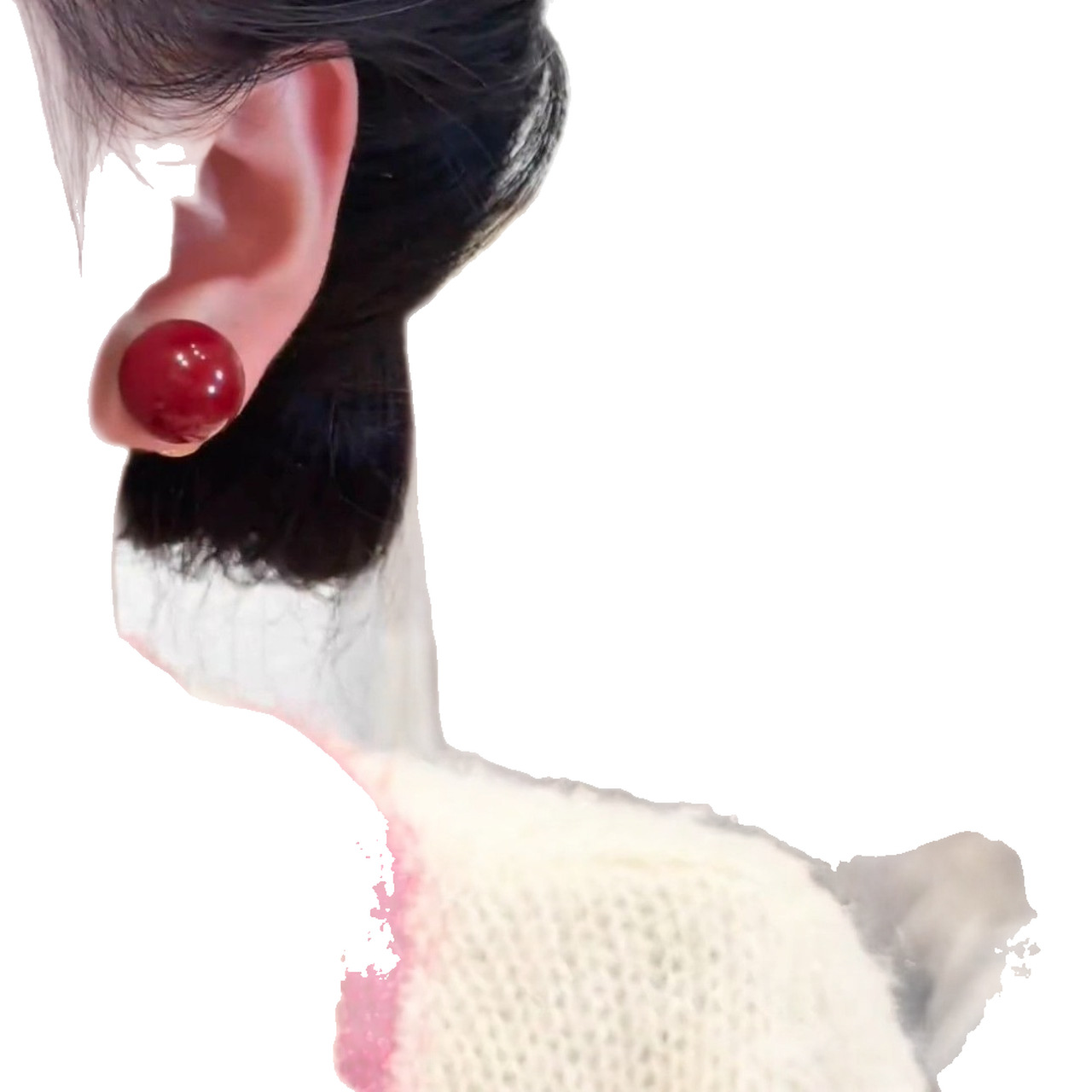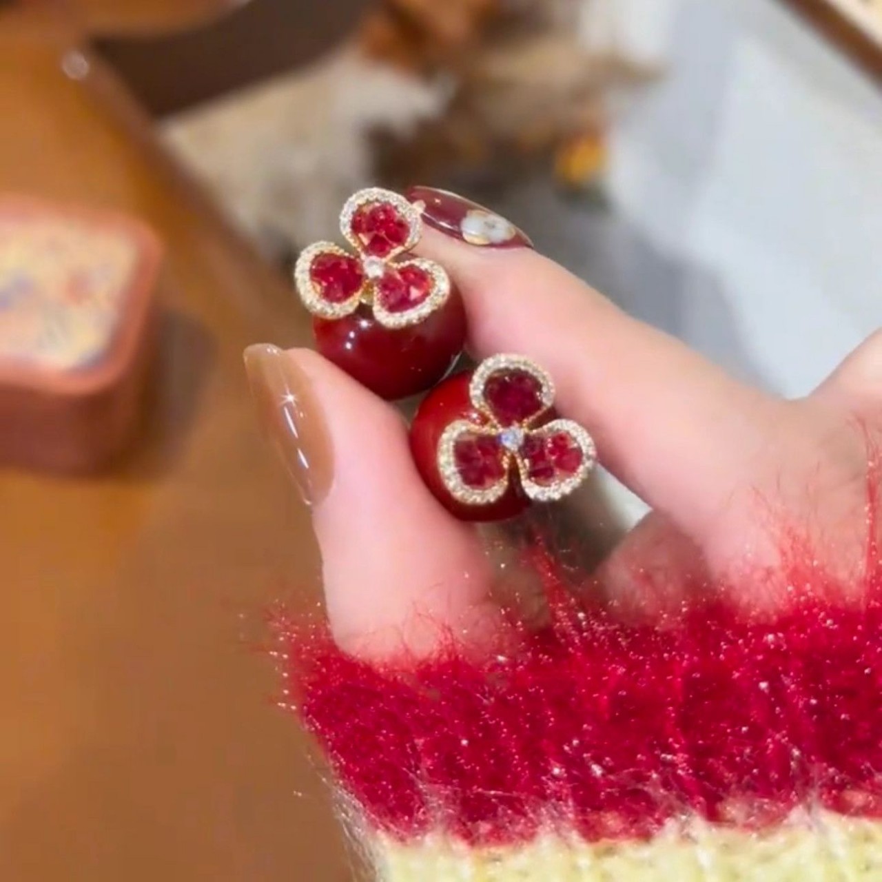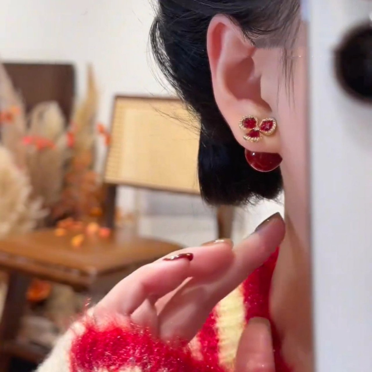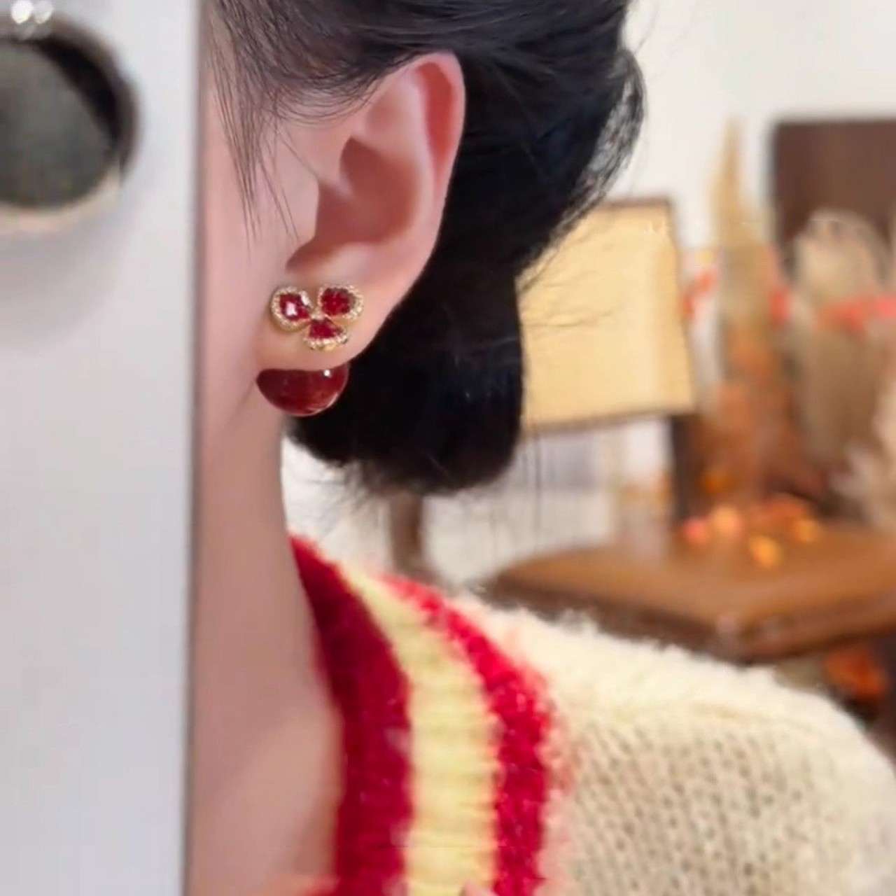 新款前后式一款两戴红色花朵圆珠耳钉女小众设计高级耳环独特耳饰