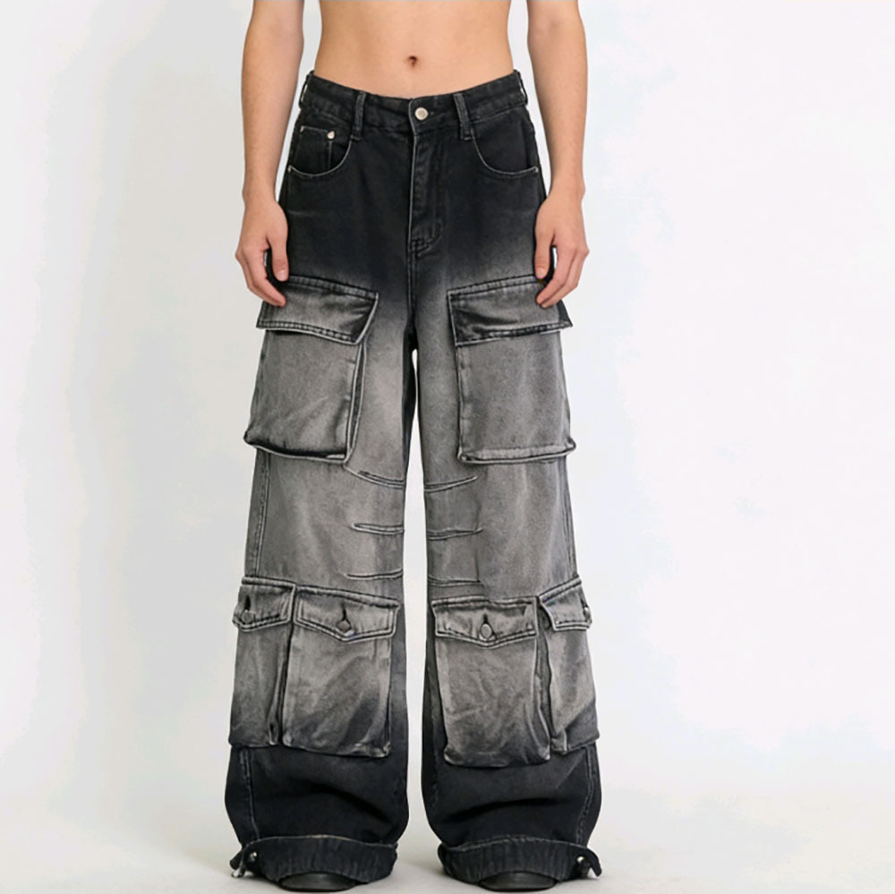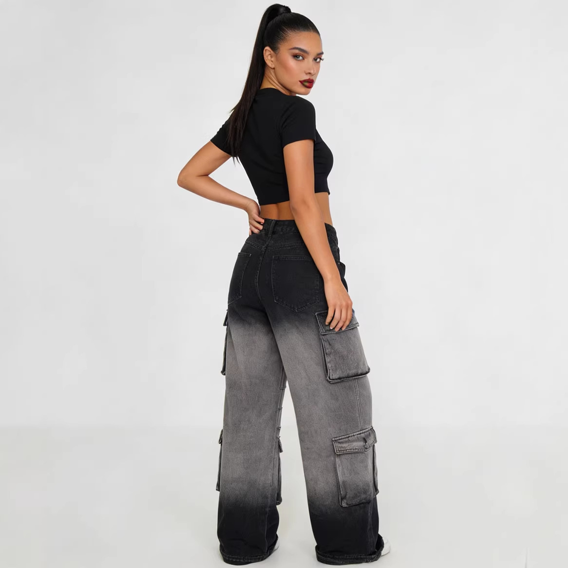 欧美女式牛仔工装裤亚马逊跨境女装街头时尚渐变色多口袋直筒裤