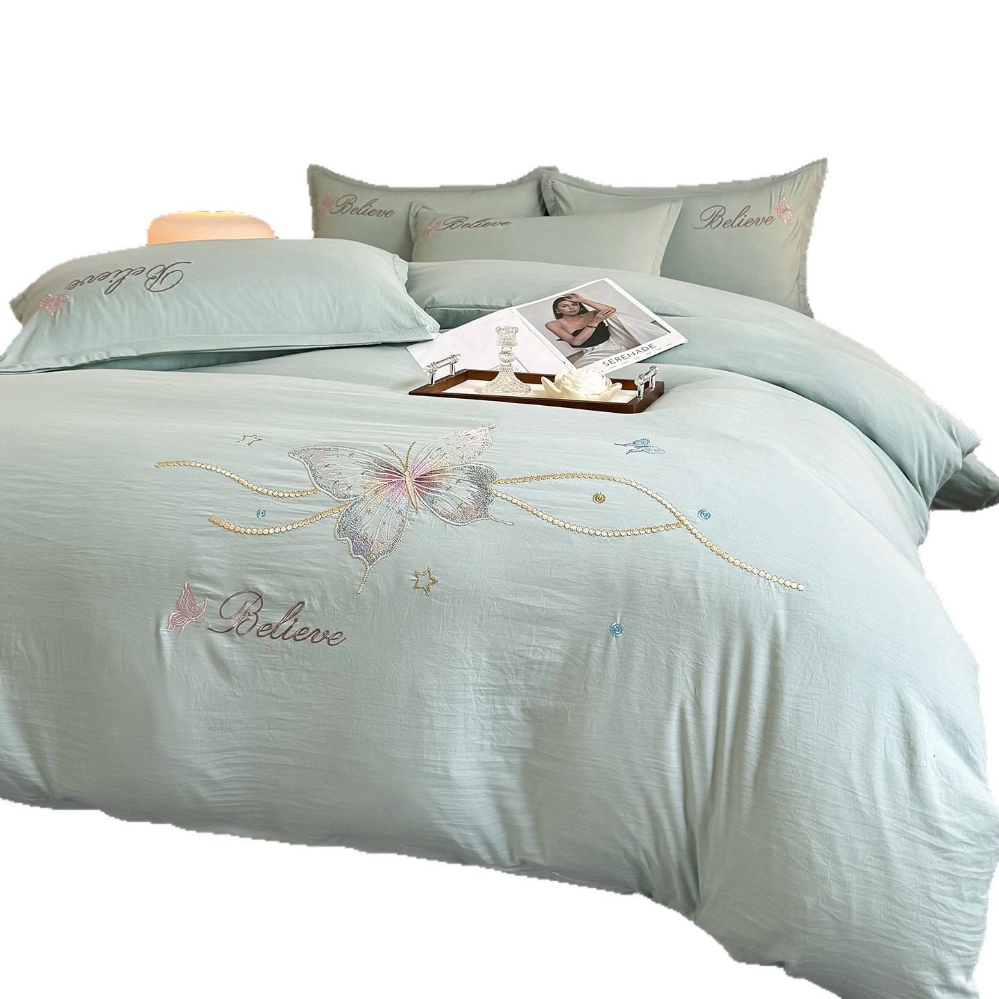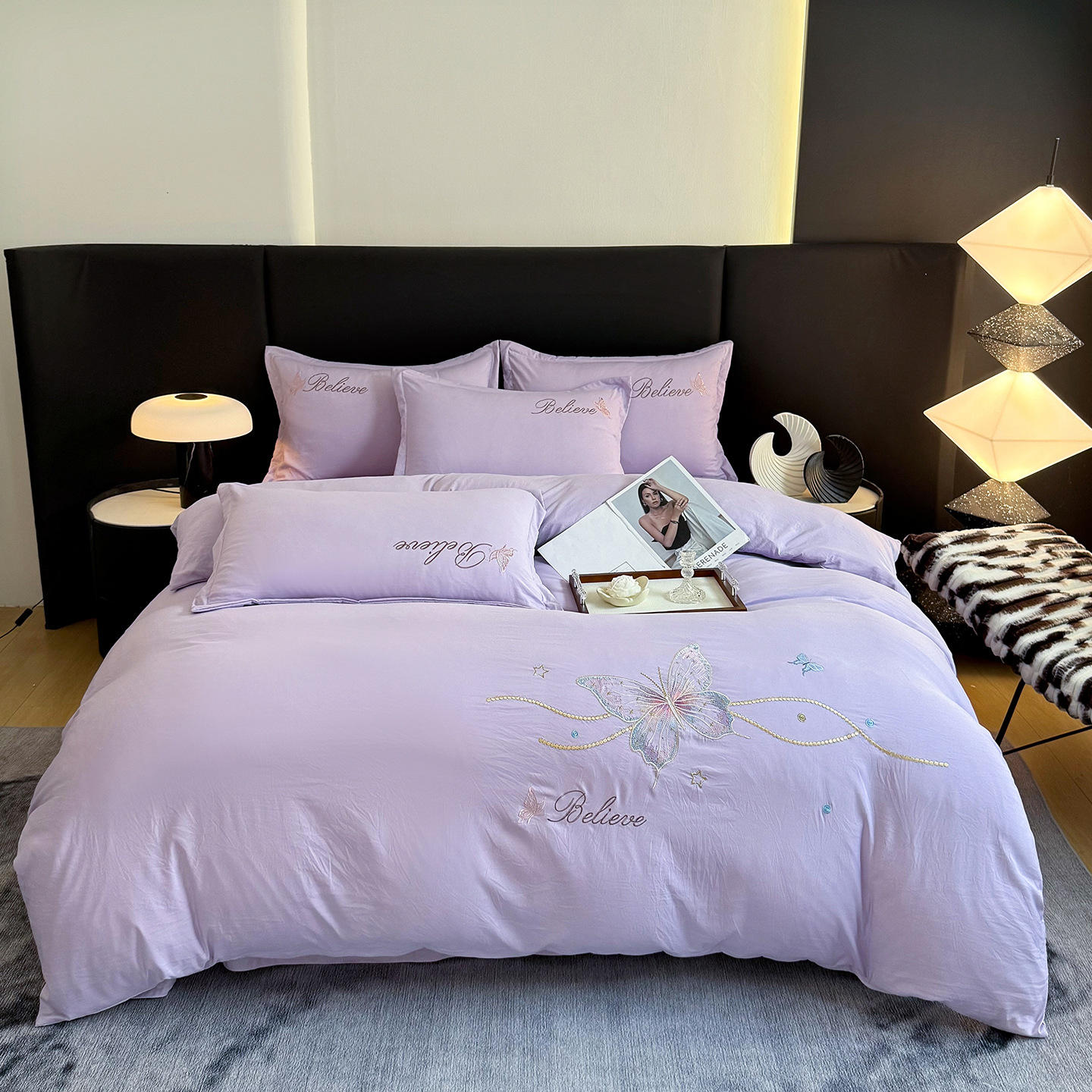 25年爆款新款浅紫色刺绣四件套花间四季通用棉被单套跨境被罩批发