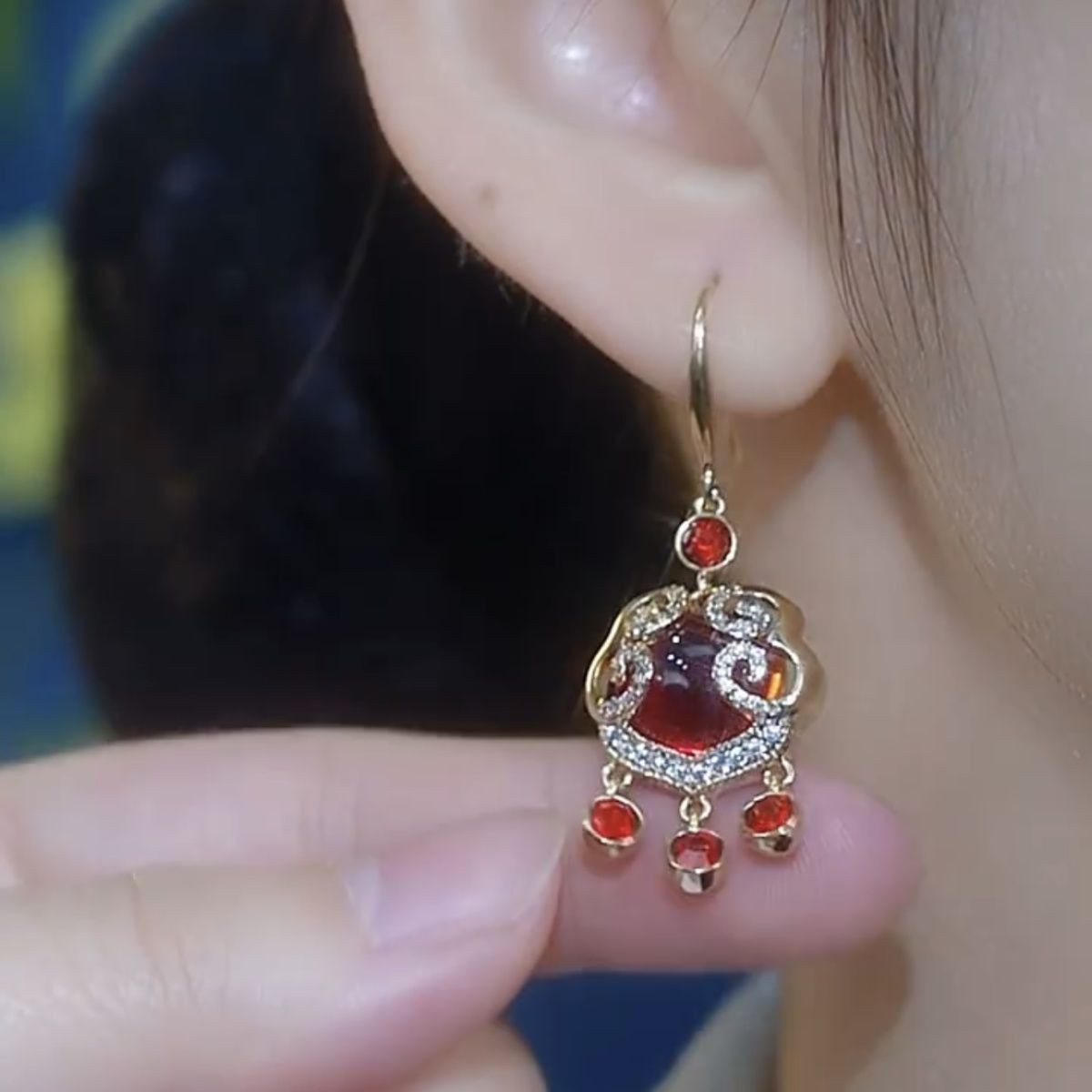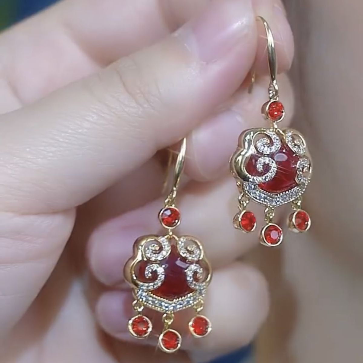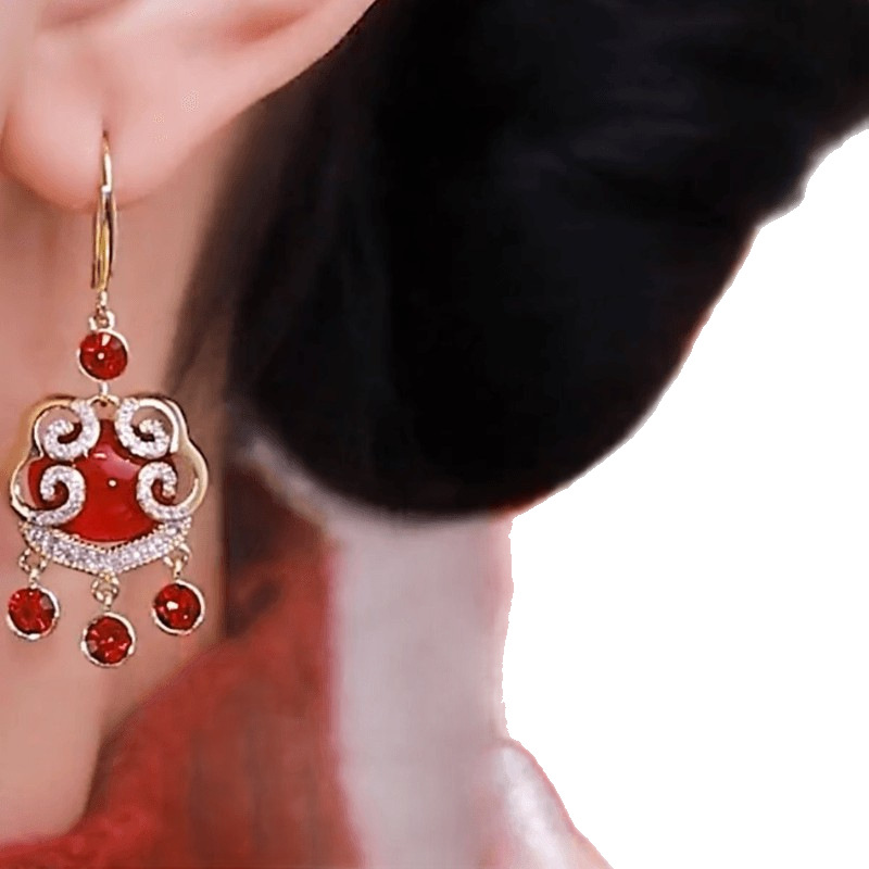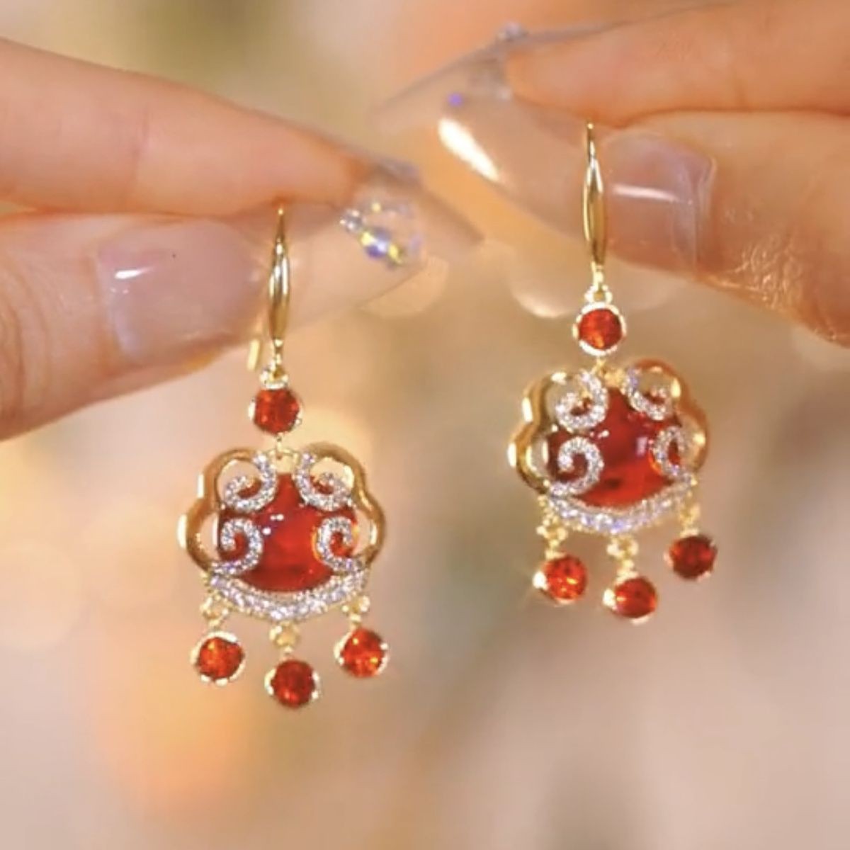 新年喜庆红色平安锁流苏祥云耳环女新款小众设计高级气质百搭耳饰