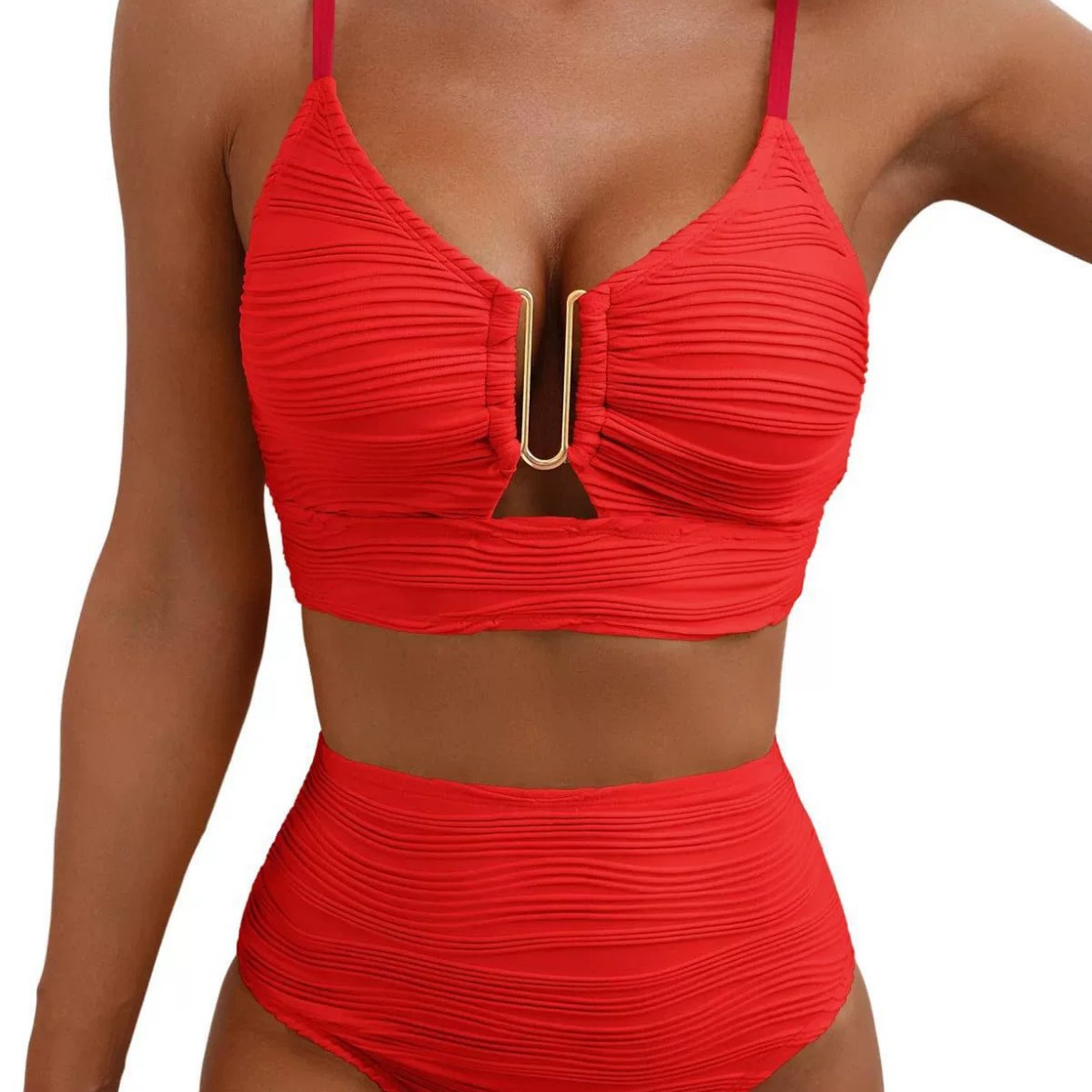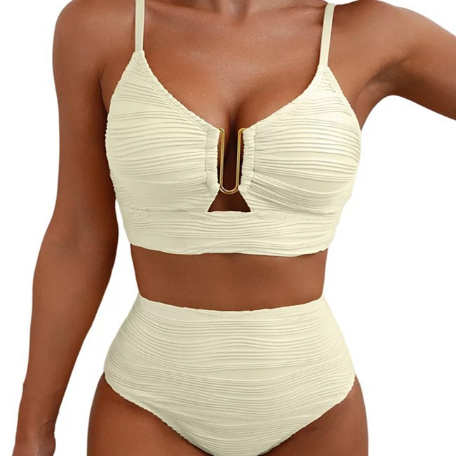2025新款欧美跨境金属配件分体泳衣女波纹面料性感比基尼两件套