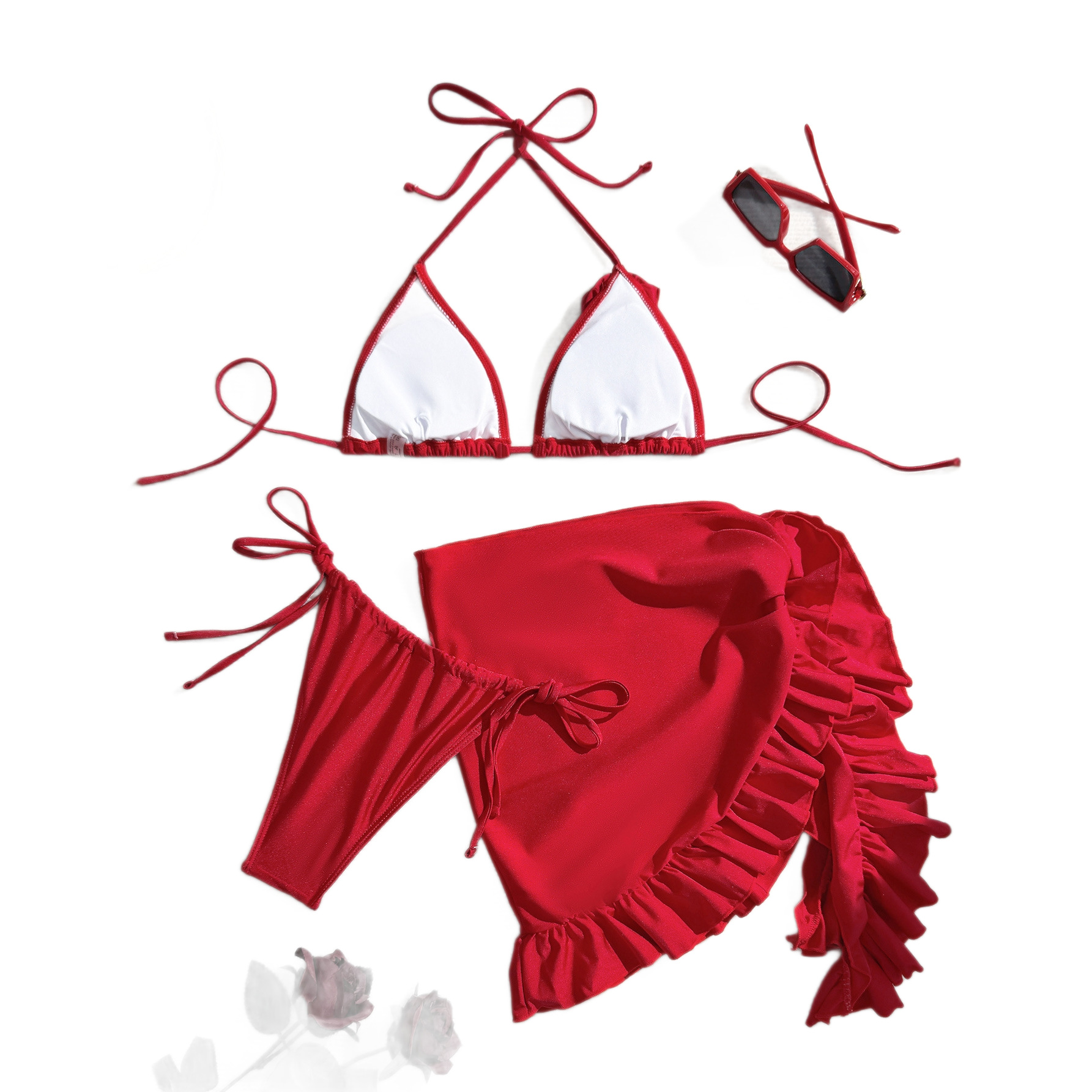 兴城泳装欧美网纱裙摆褶皱荷叶边三件套比基尼挂脖bikini定制裙式
