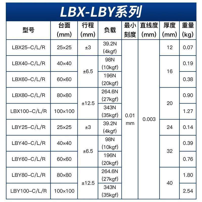 | 滑轨长度 | LBX60-R※台面60*60 高16※右 行程±6.5 负载20kg | 滑轨长度 | LBY25-L※台面25*25 高24※左 行程±3 负载4kg |
