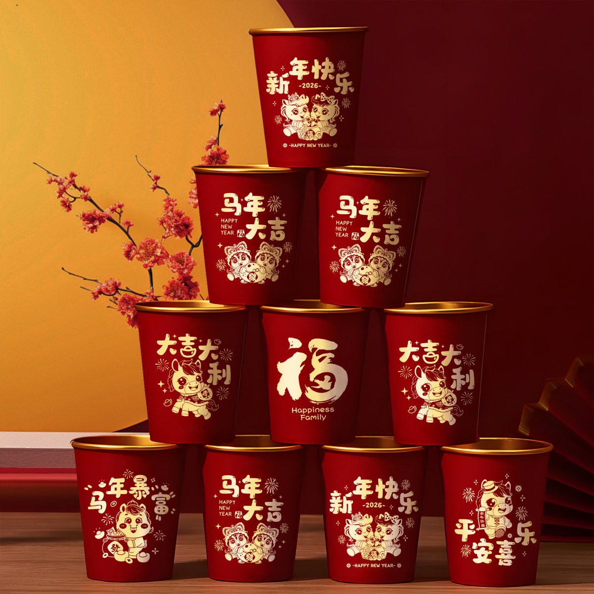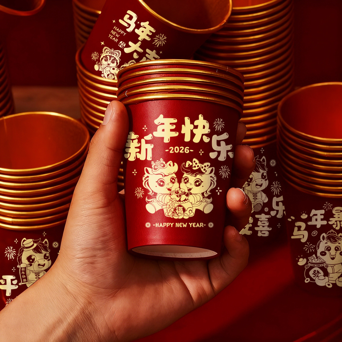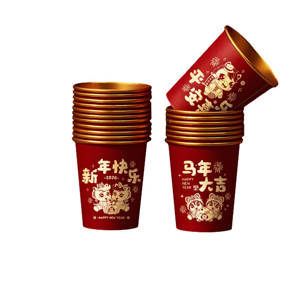 2026马年新款春节纸杯加厚一次性新年过年福字金箔纸杯子家用批发
