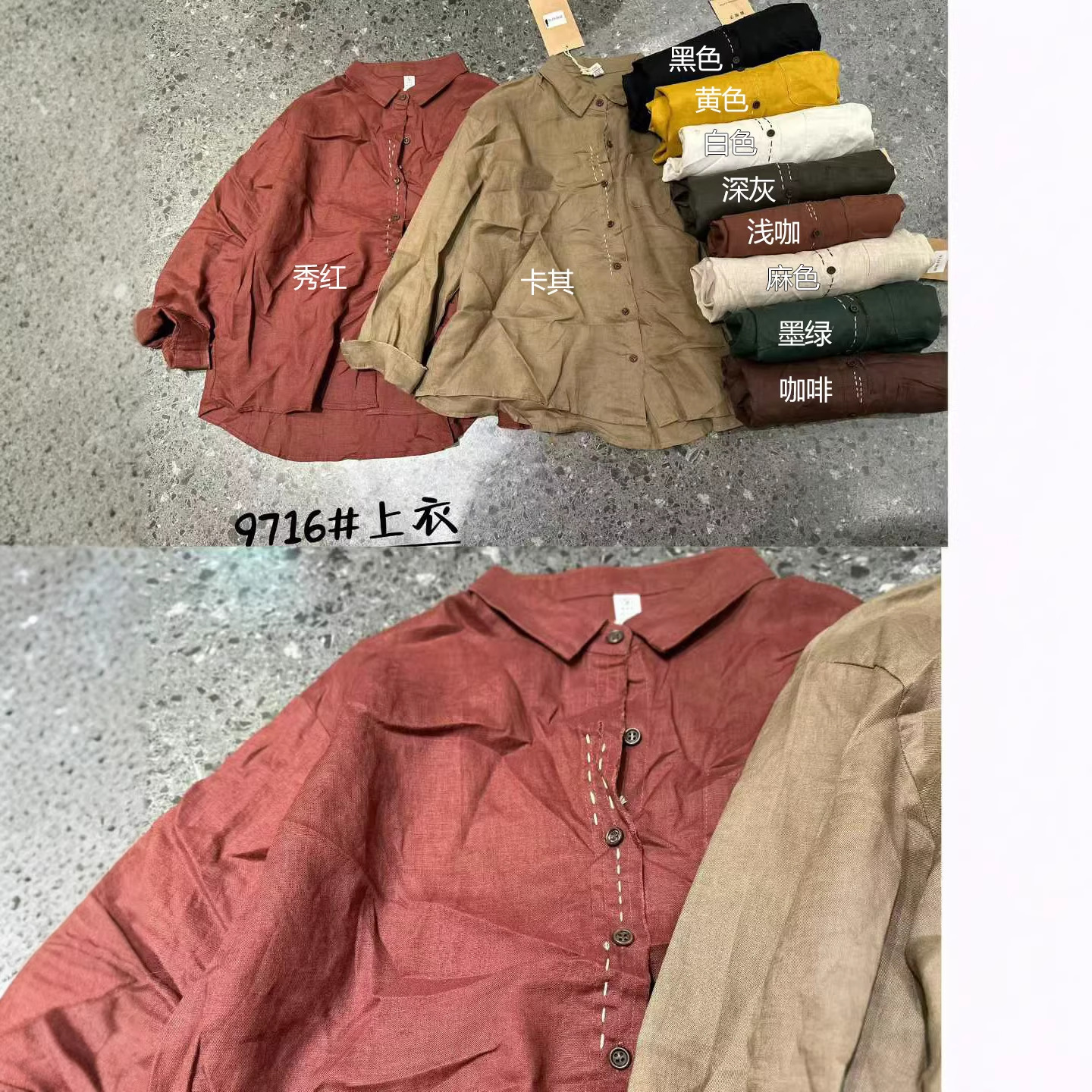 cz9716翻领单排扣拼接长袖复古刺绣衬衣2026新品亚麻宽松衬衫女装