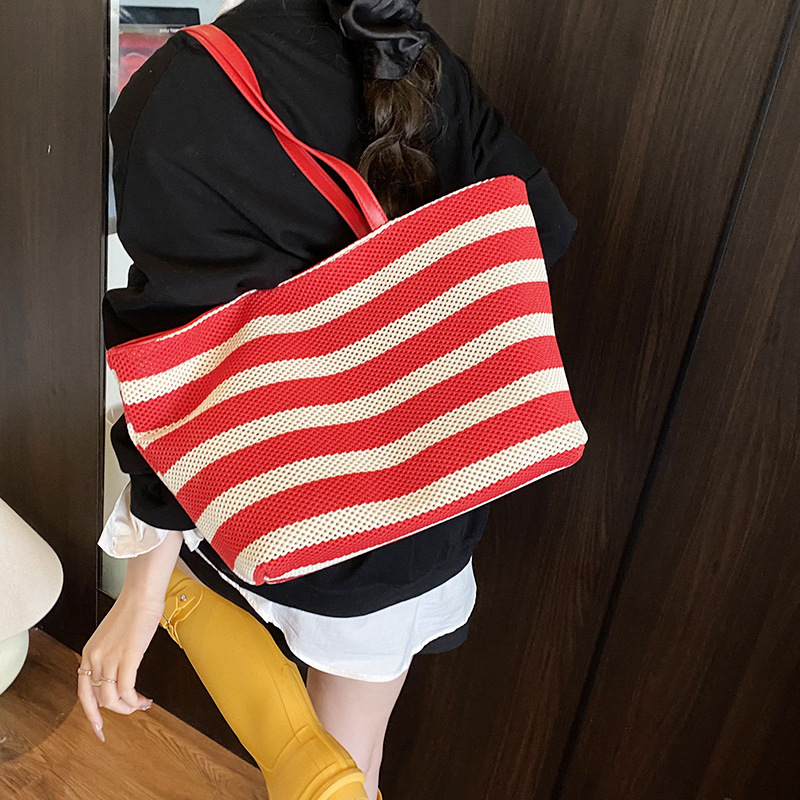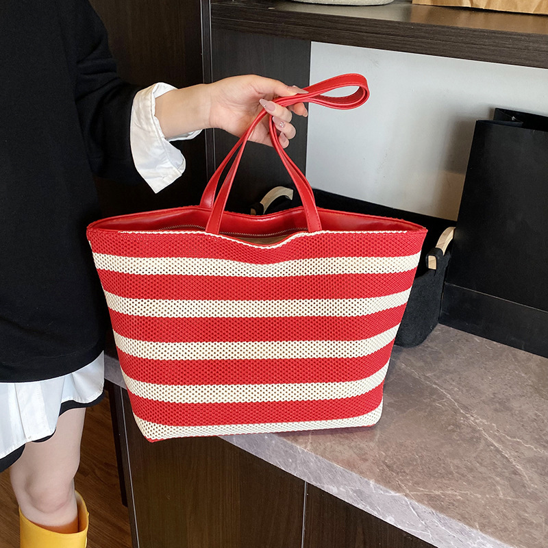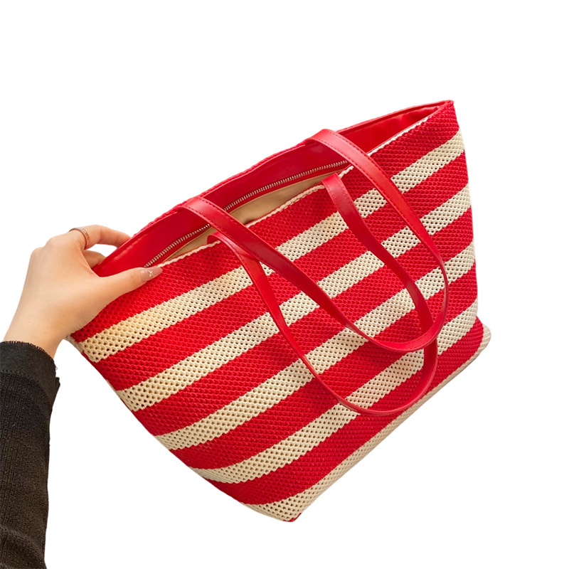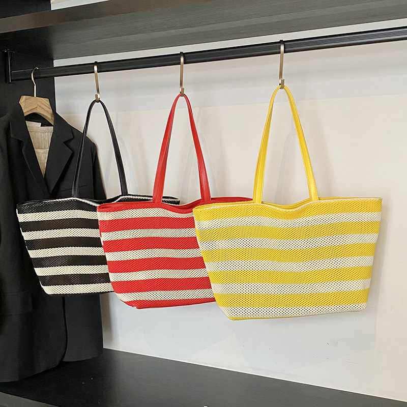 2025大容量托特包拼接撞色水桶包夏季新款镂空编织包慵懒风包代发