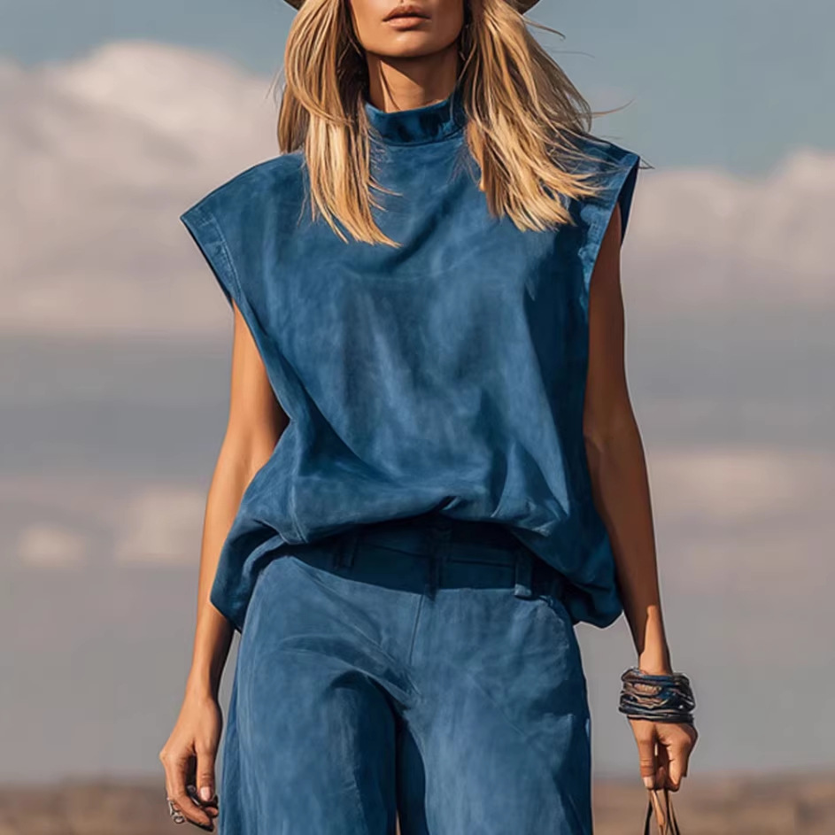 欧美亚马逊独立站跨境2026时尚新款女士西部风无袖阔腿麂皮绒套装