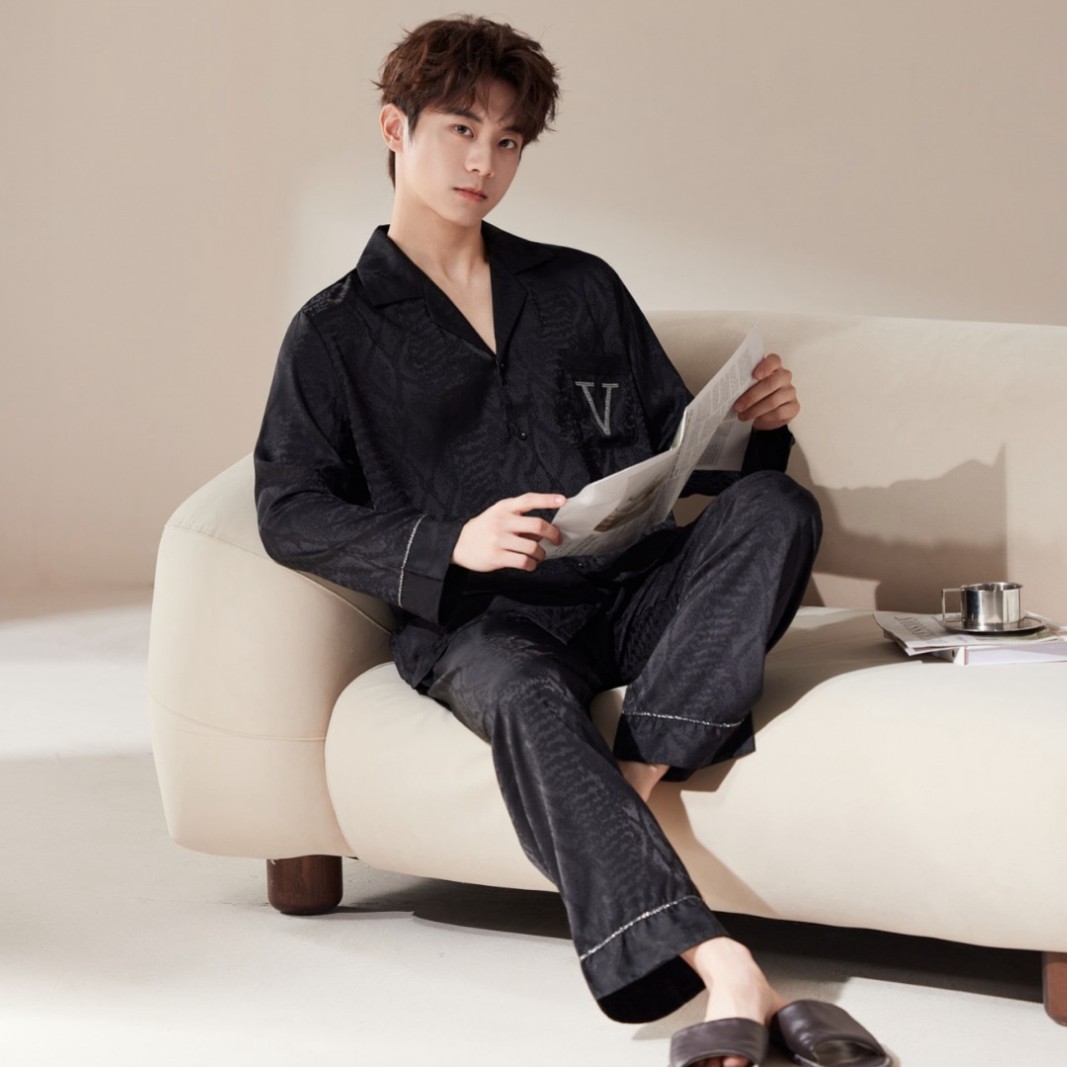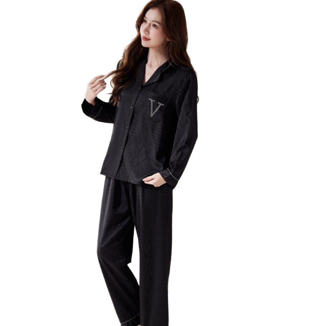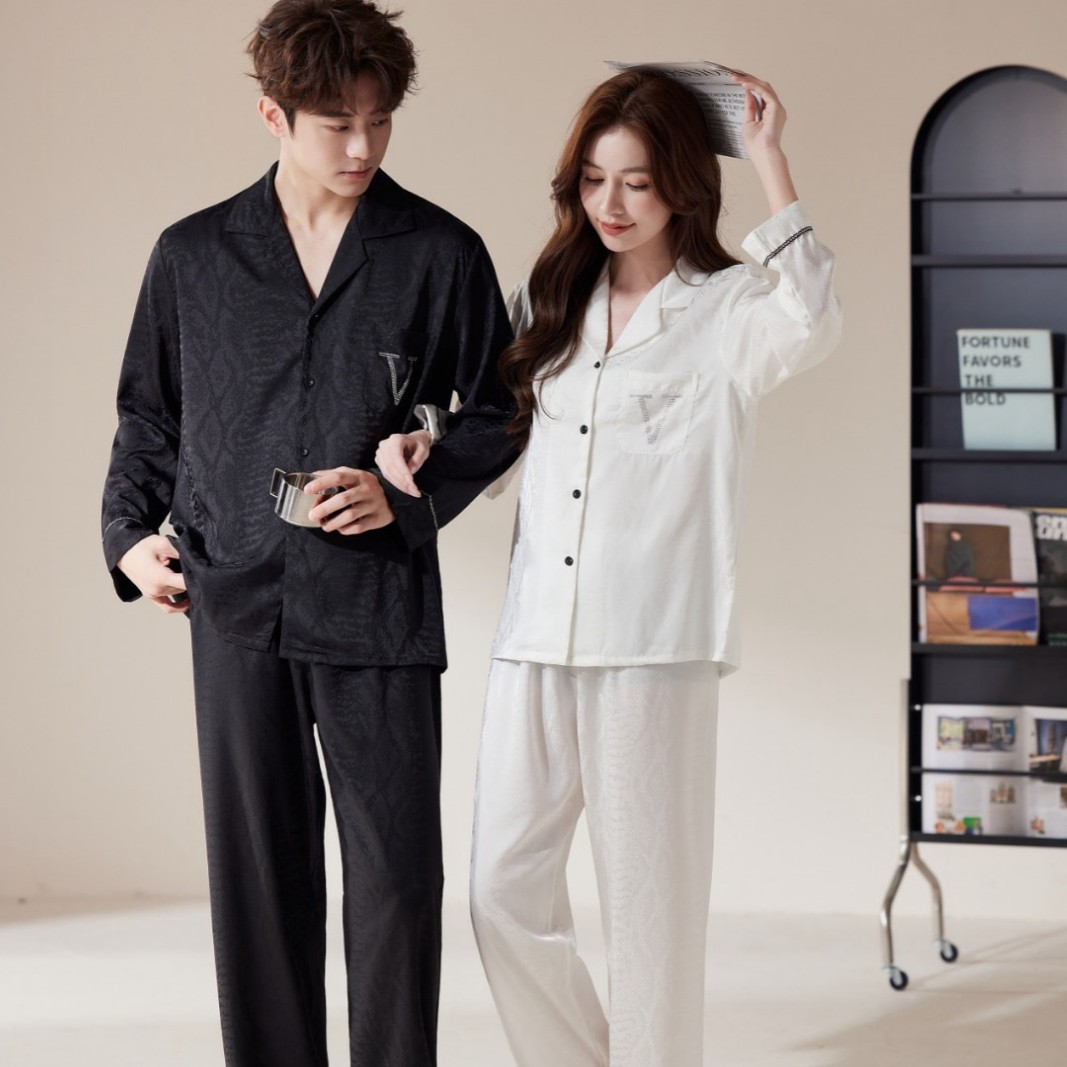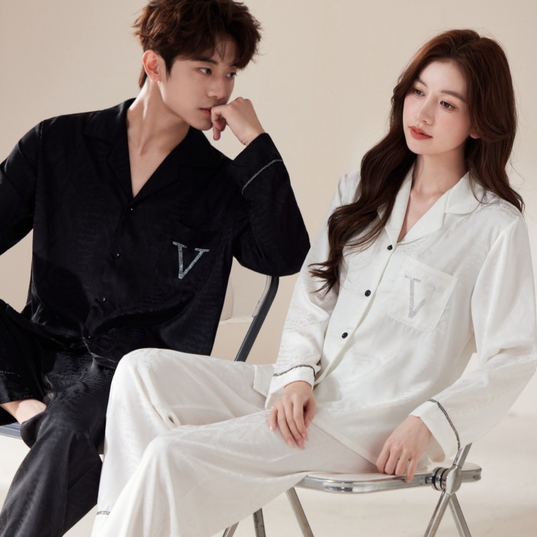 跨境情侣款黑白色冰丝睡衣男女同款春秋季可外穿家居服套装批发