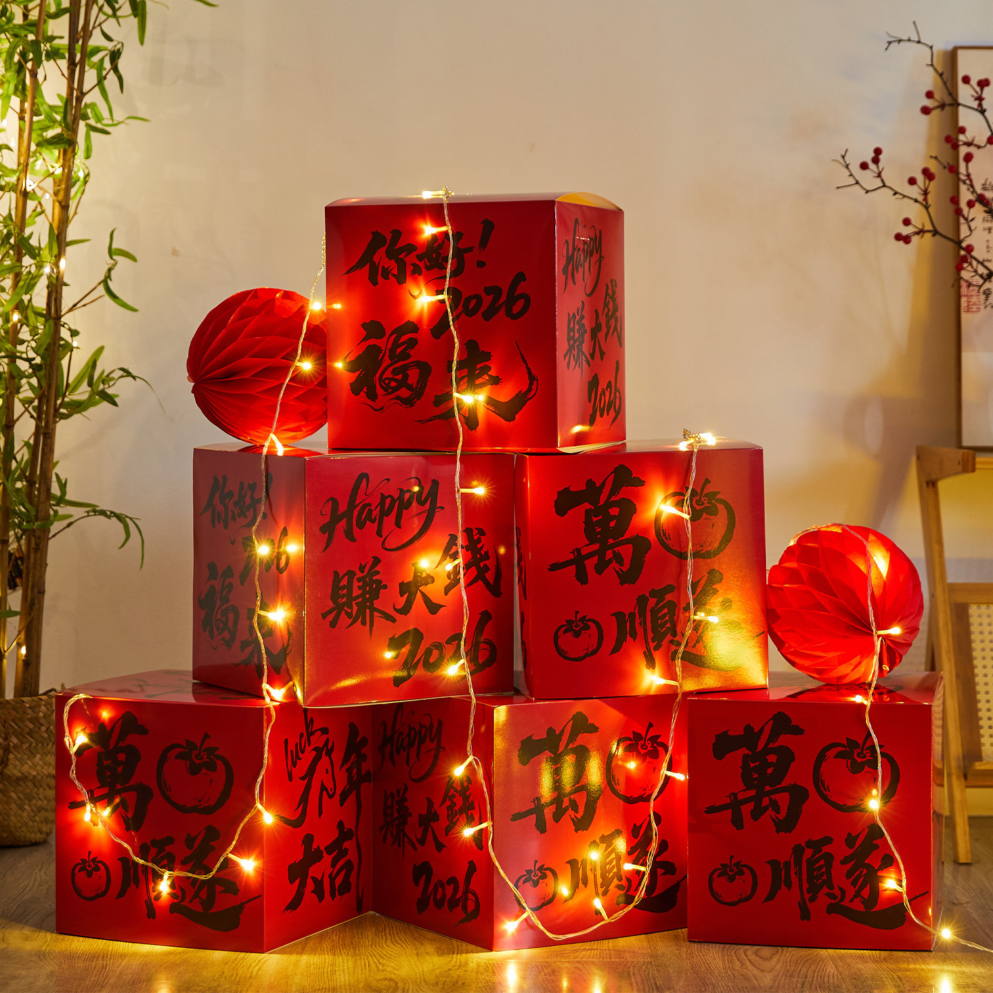 尺寸 | 新年03款礼盒4个 | | 尺寸 | 全红灯笼大4中2+福字灯笼大2小1+01礼盒3个+立体福1+支架2 |