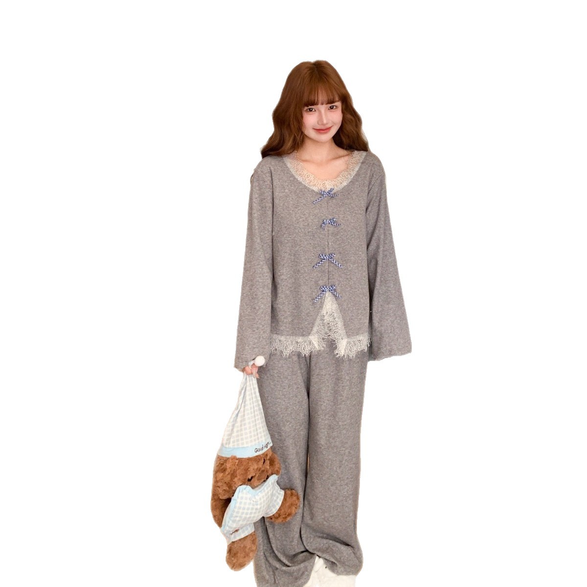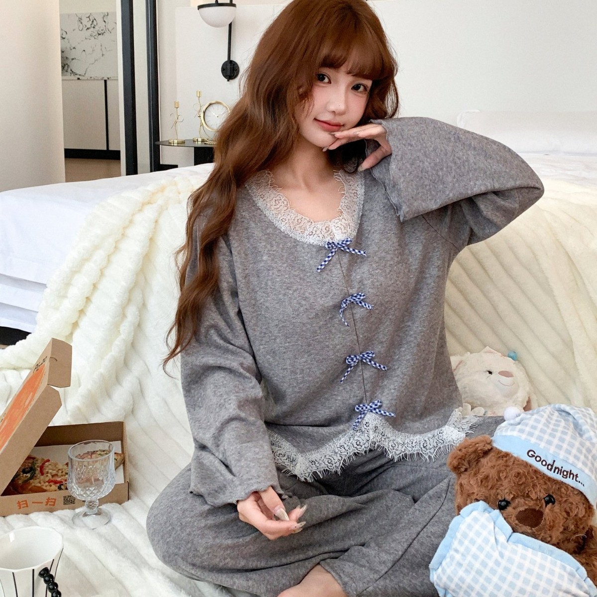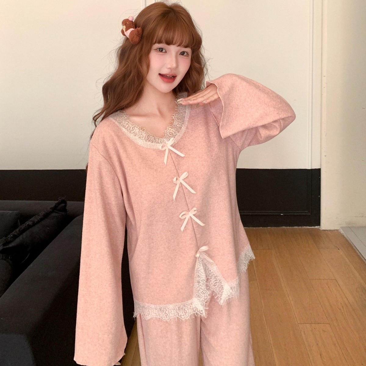 新跨境秋冬毛巾绒女士睡衣带胸垫款蕾丝边家居服套装可外穿花边款