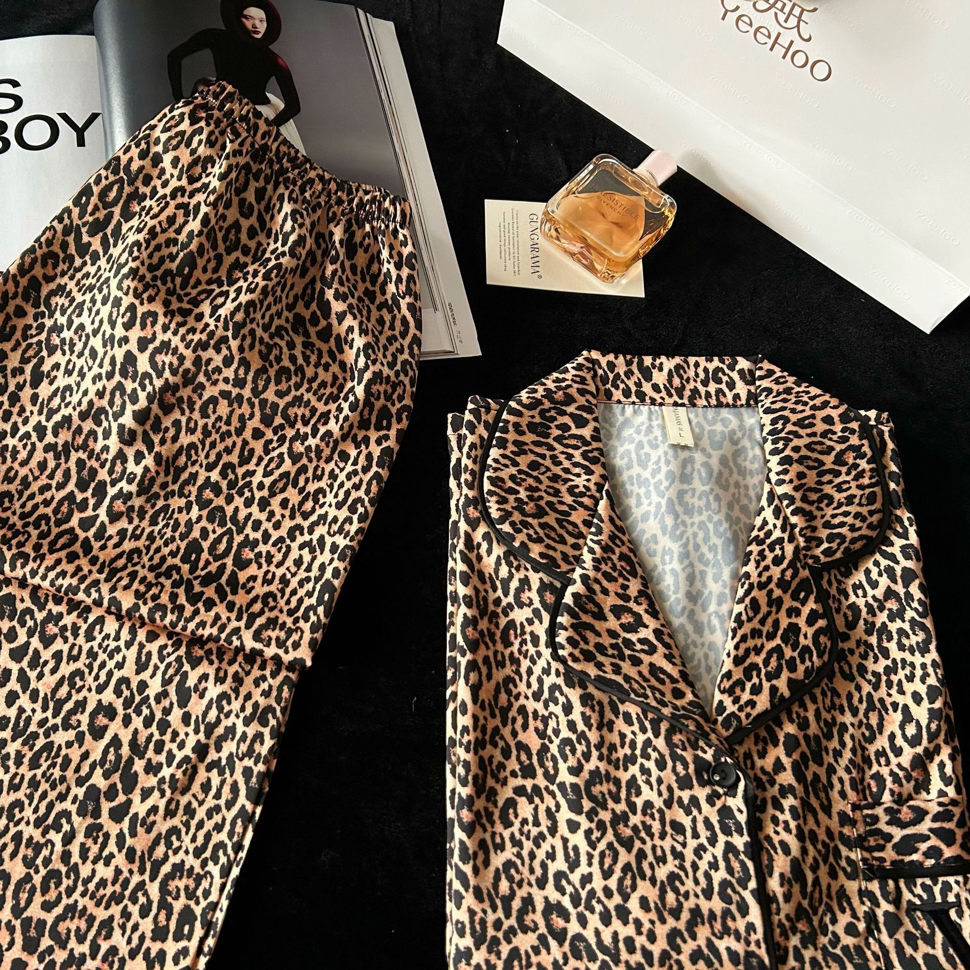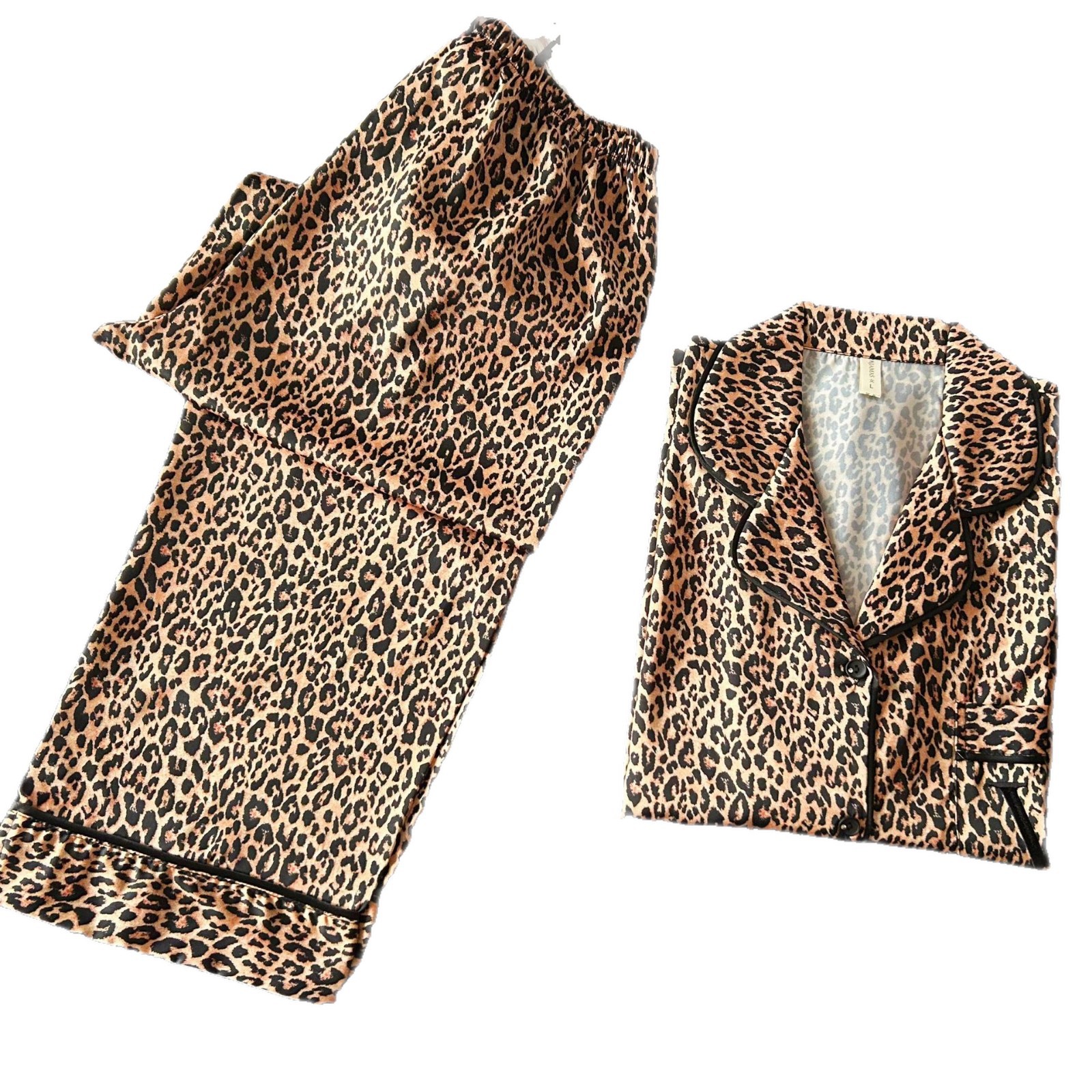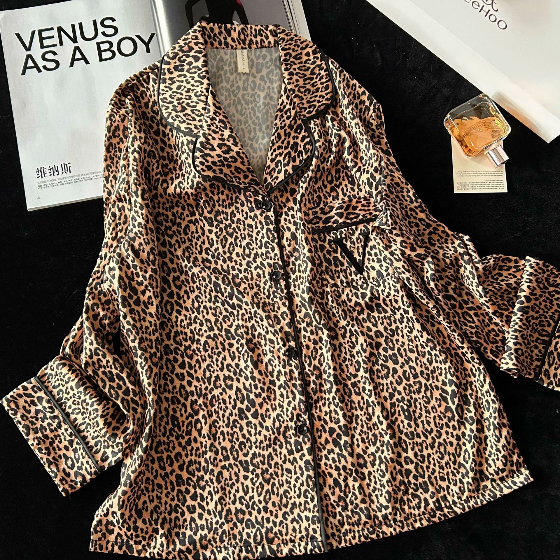 2026新款睡衣跨境外贸V家豹纹冰丝睡衣女长袖长裤套装外穿家居服