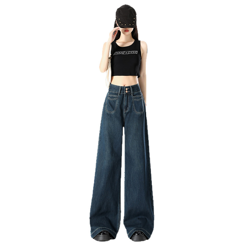 2025年秋季新款牛仔长裤女高腰两粒扣宽松垂感直筒阔腿喇叭拖地裤