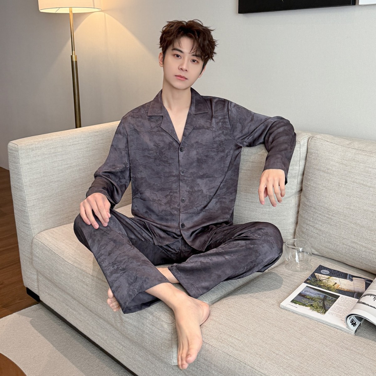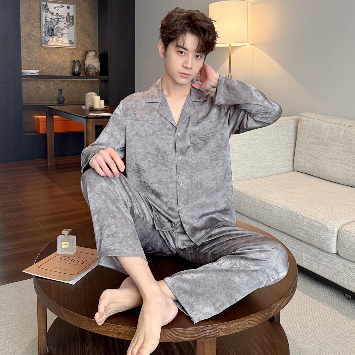 2026春秋季男士睡衣冰丝提花套装轻奢居家服可外穿外贸批发薄款
