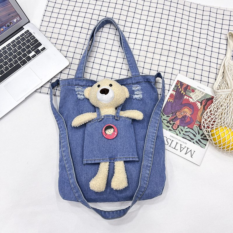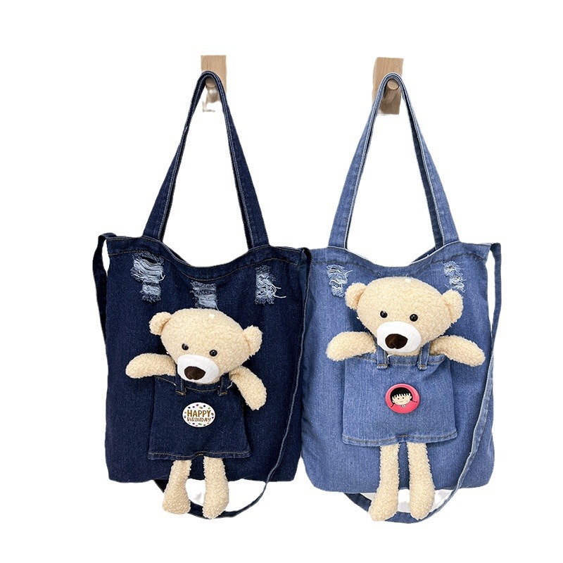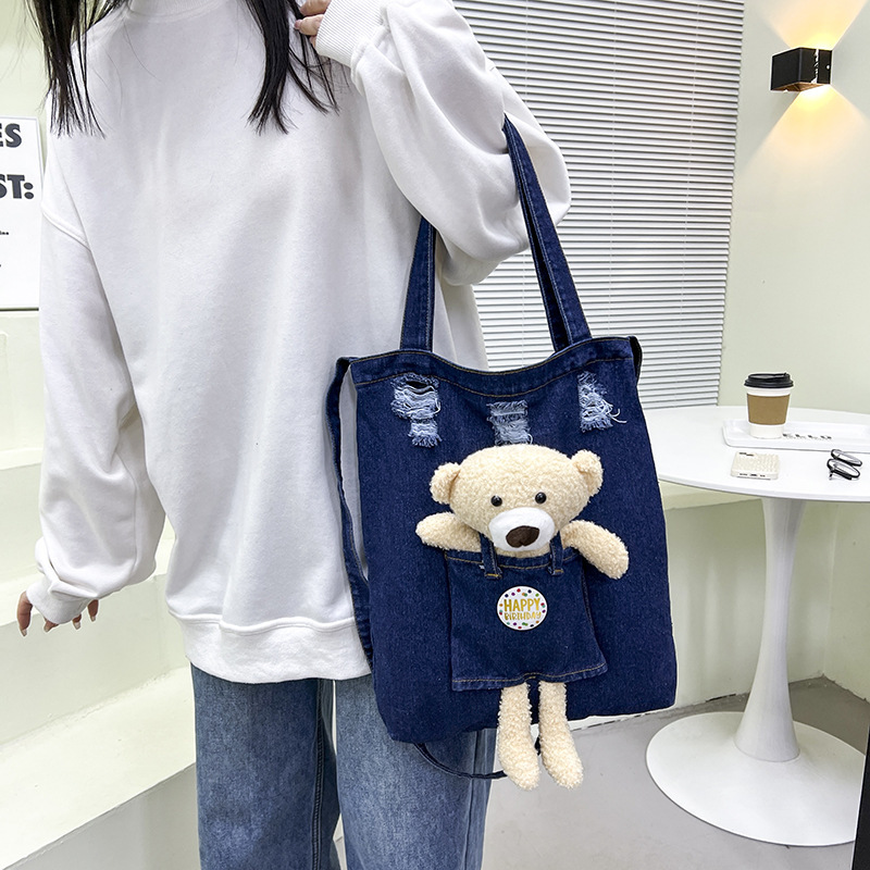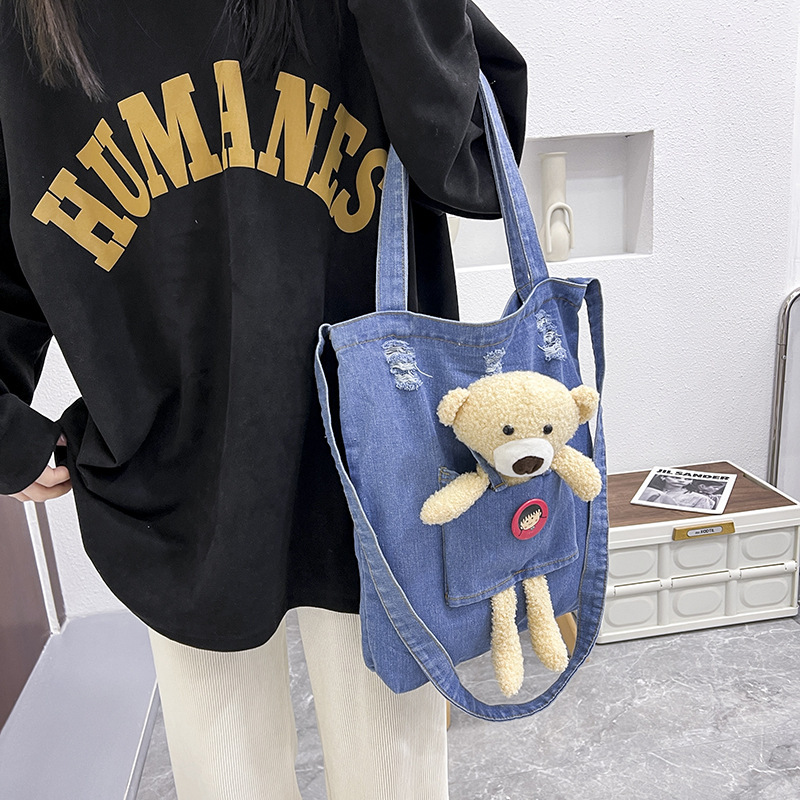 2025新款韩版时尚小熊牛仔包大容量女士单肩包个性休闲学生托特包