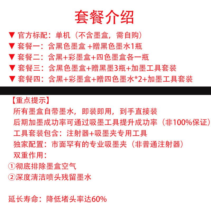 | 型号 | 21/23系列插线打印机+ 黑彩墨盒+4色墨水*2+加墨工具+纸 | 型号 | 21/23系列无线打印机+黑彩双墨盒+4色墨水+A4纸 |