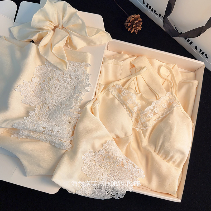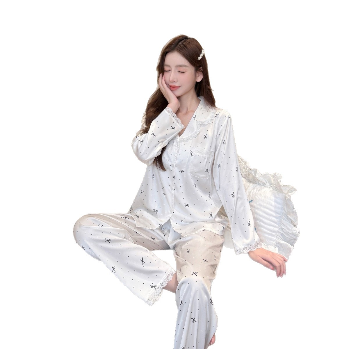 2026跨境蝴蝶结长袖长裤高级冰丝睡衣女蕾丝小红书抖音同款家居服