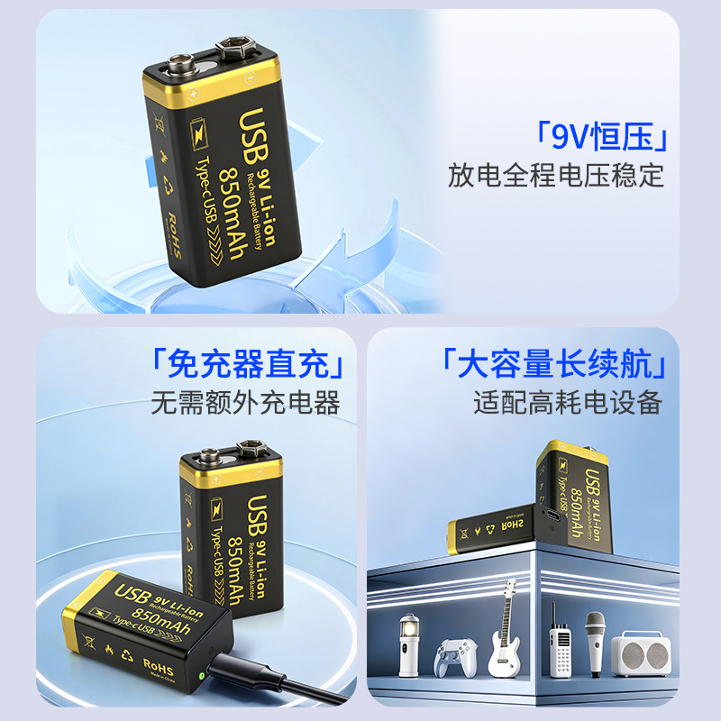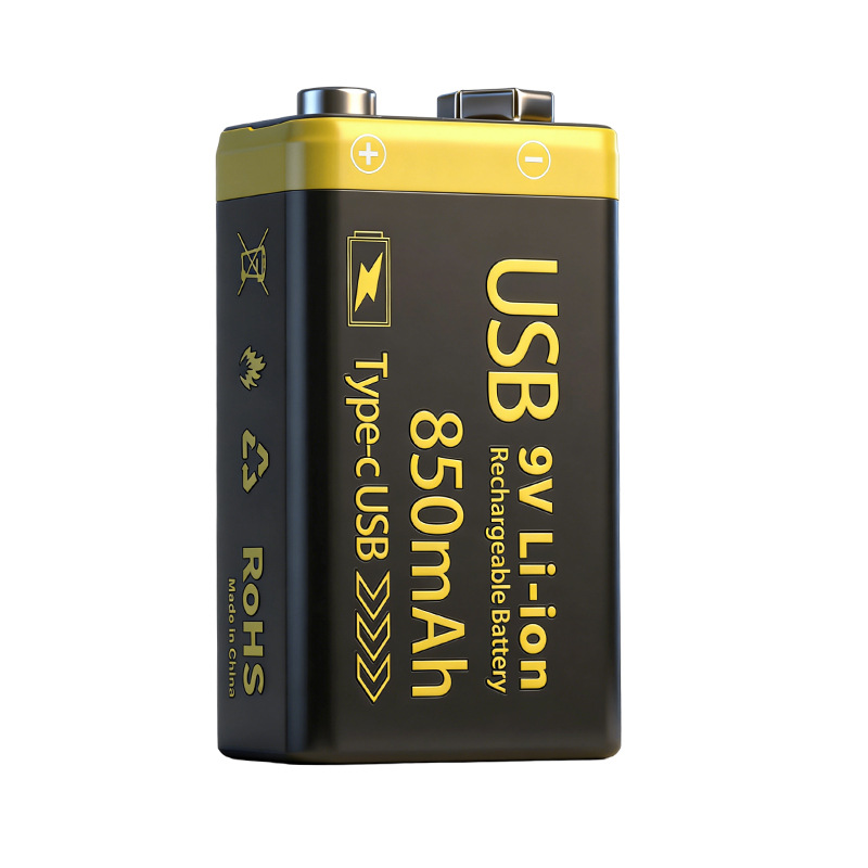 9V充电电池USB-C锂离子电池850mAh吉他话筒万用表电池方形锂电池