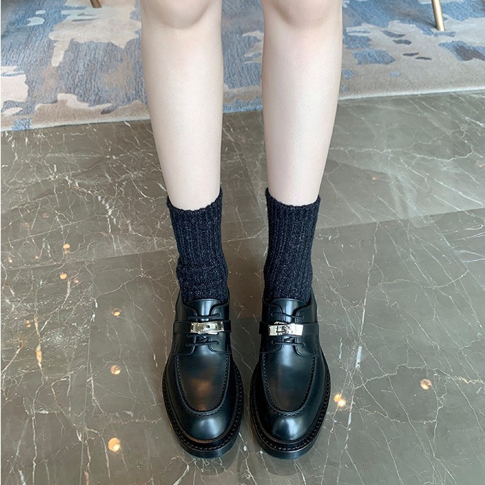 羊皮版~真皮锁扣黑色复古圆头乐福鞋女粗跟英伦风小皮鞋牛津单鞋
