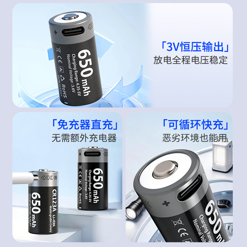 恒压3V锂电池CR123A 650mAh充电电池手电美容仪灯具玩具USB锂电池