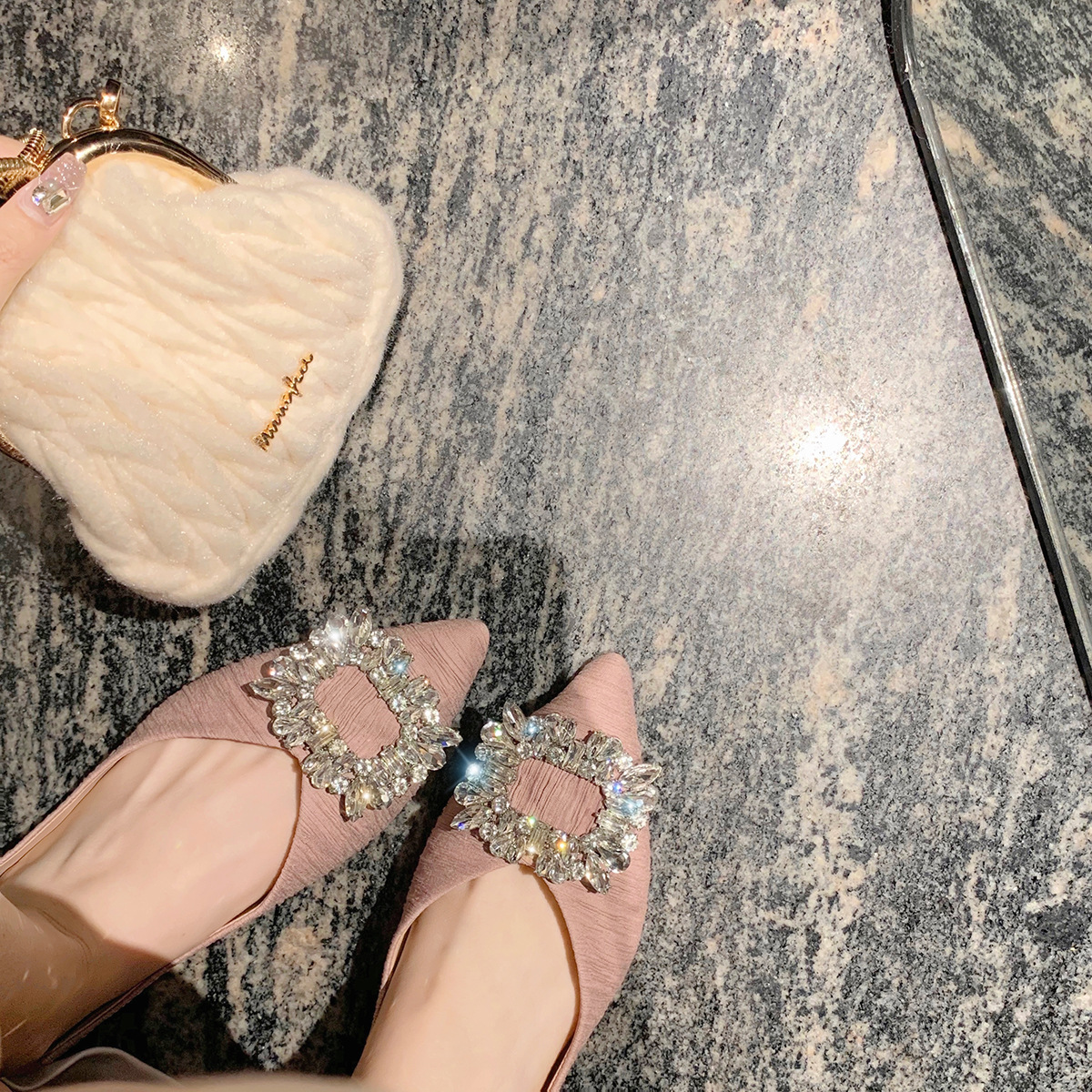 高级感羊皮版~葡萄ma同款法式方扣水钻尖头浅口仙女平底鞋女单鞋