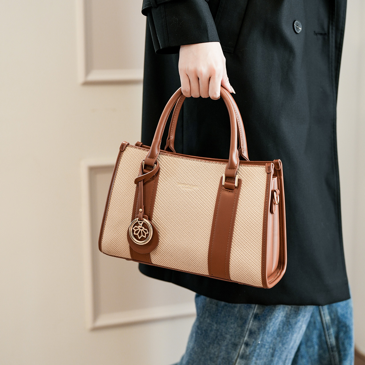 烫金字母经典仿布纹手提包跨境女包高级感包新款名媛单肩包斜挎包