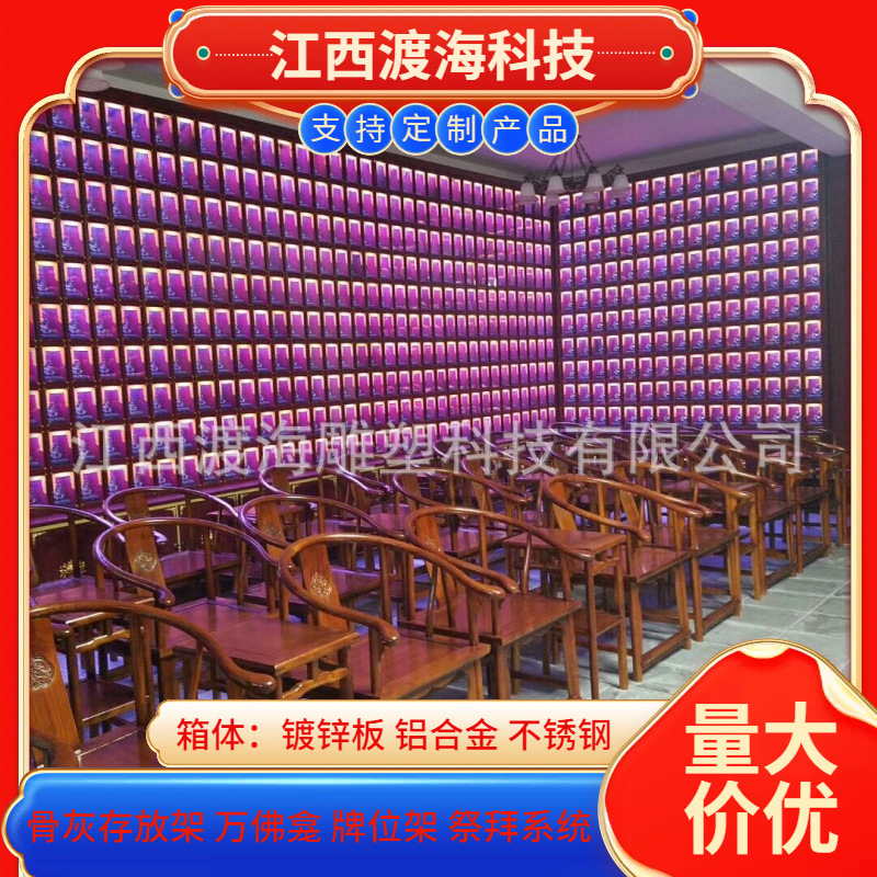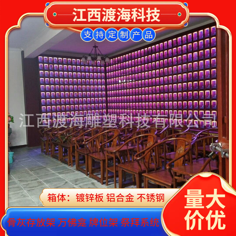 主营产品:骨灰存放架,骨灰盒寄存架,福寿架,万佛龛,牌位架,殡仪馆祭拜系统,寺院智能化管理系统、龙骨吊顶、智能骨灰寄存架