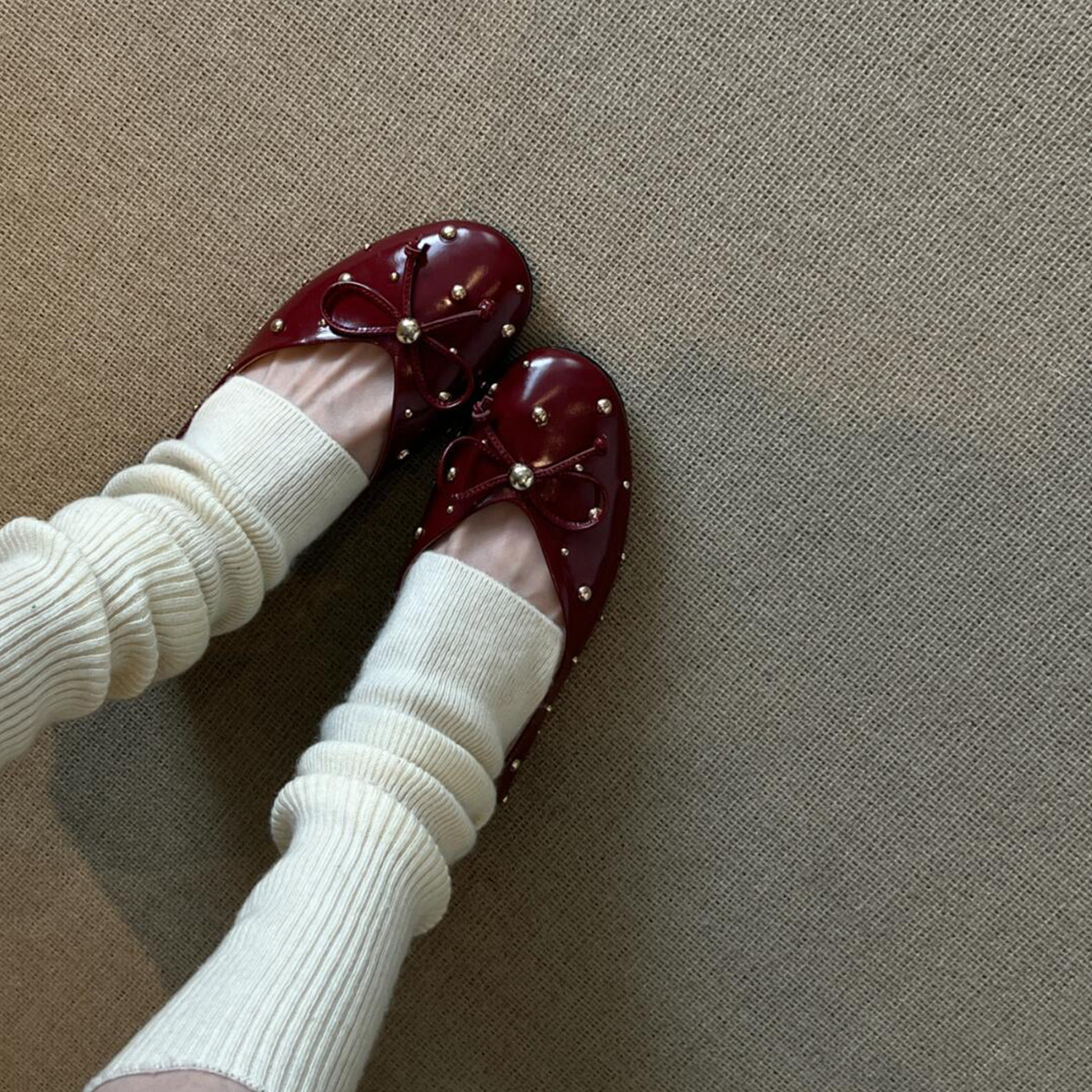 羊皮版~时尚简约浅口单鞋蝴蝶结铆钉真皮一脚蹬百搭芭蕾舞平底鞋