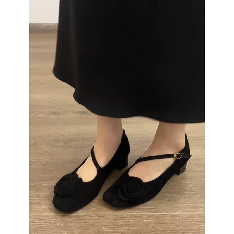 羊皮版~复古方头浅口一字带玛丽珍鞋女小众时尚花朵通勤粗跟单鞋