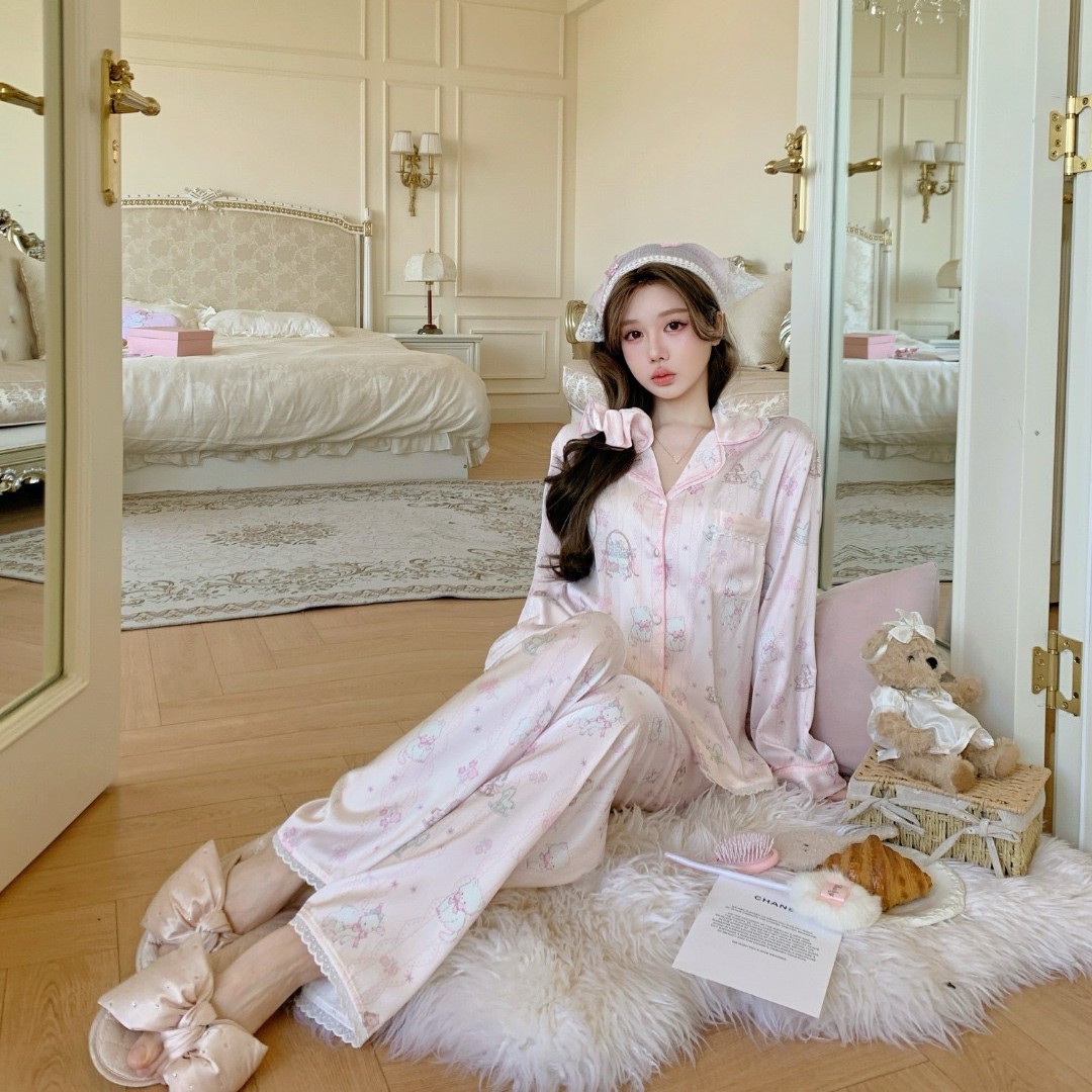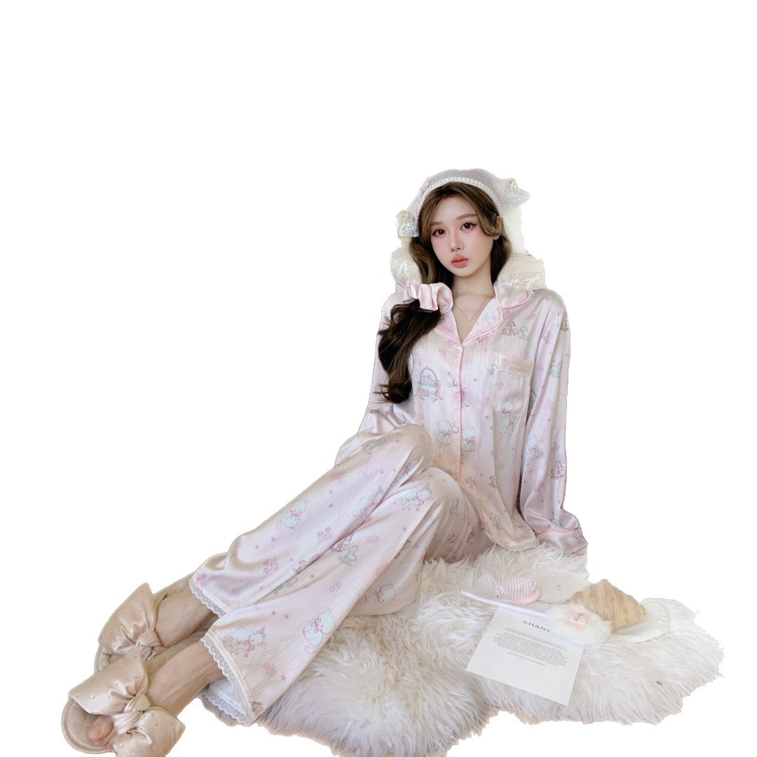 26卡通蕾丝冰丝睡衣女春秋长袖长裤家居服小红书抖音甜美外穿睡衣