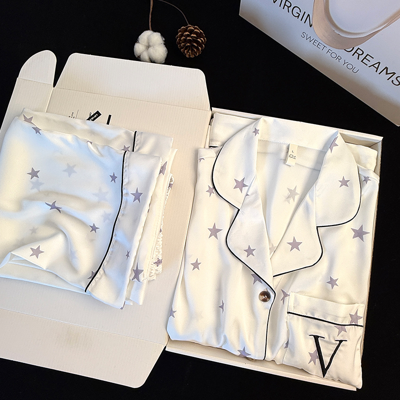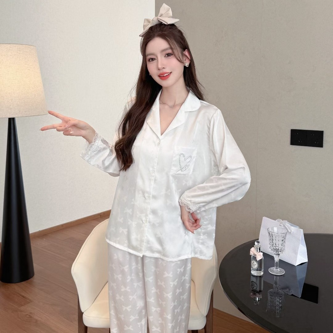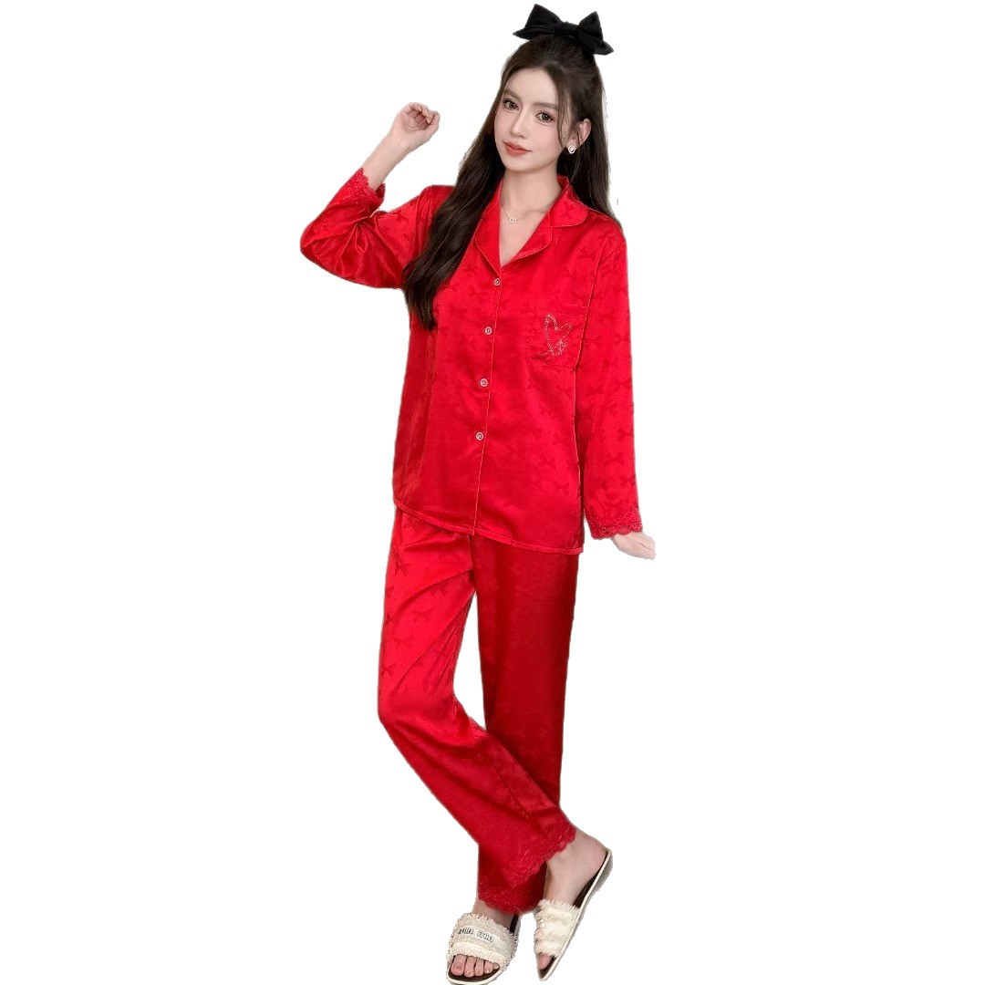 外贸爆款春秋季冰丝睡衣女蝴蝶提花口袋烫钻长袖长裤套装家居服