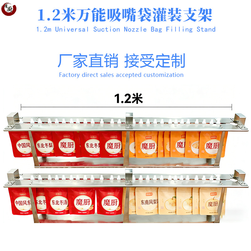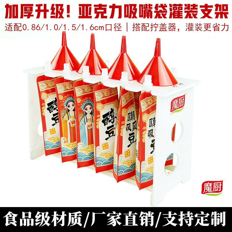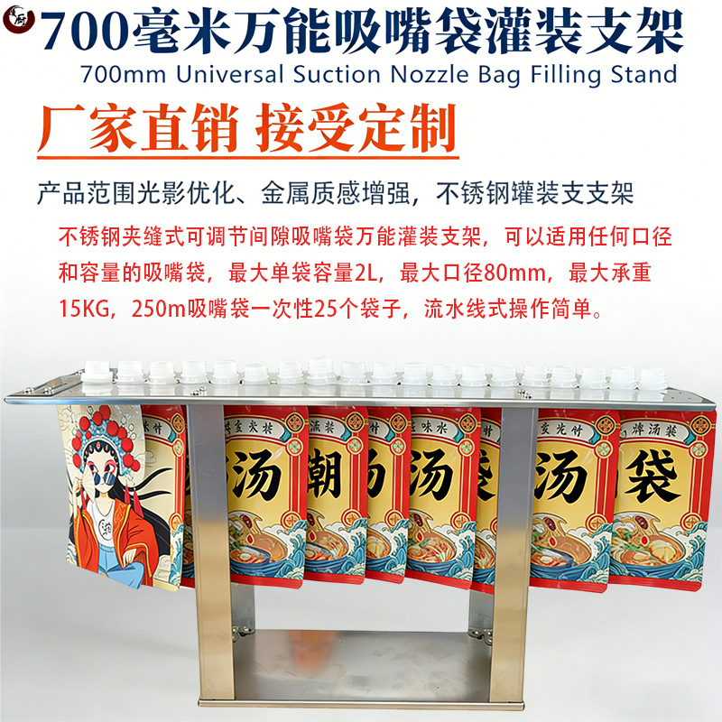 适用对象 | 自立吸嘴袋、自立袋、带吸嘴的液体包装袋、酱料袋、果冻袋、饮料袋等 | | 产品功能 | 固定吸嘴袋、辅助灌装、防洒漏、提升灌装效率、适配手动/半自动灌装机、多口径兼容 |