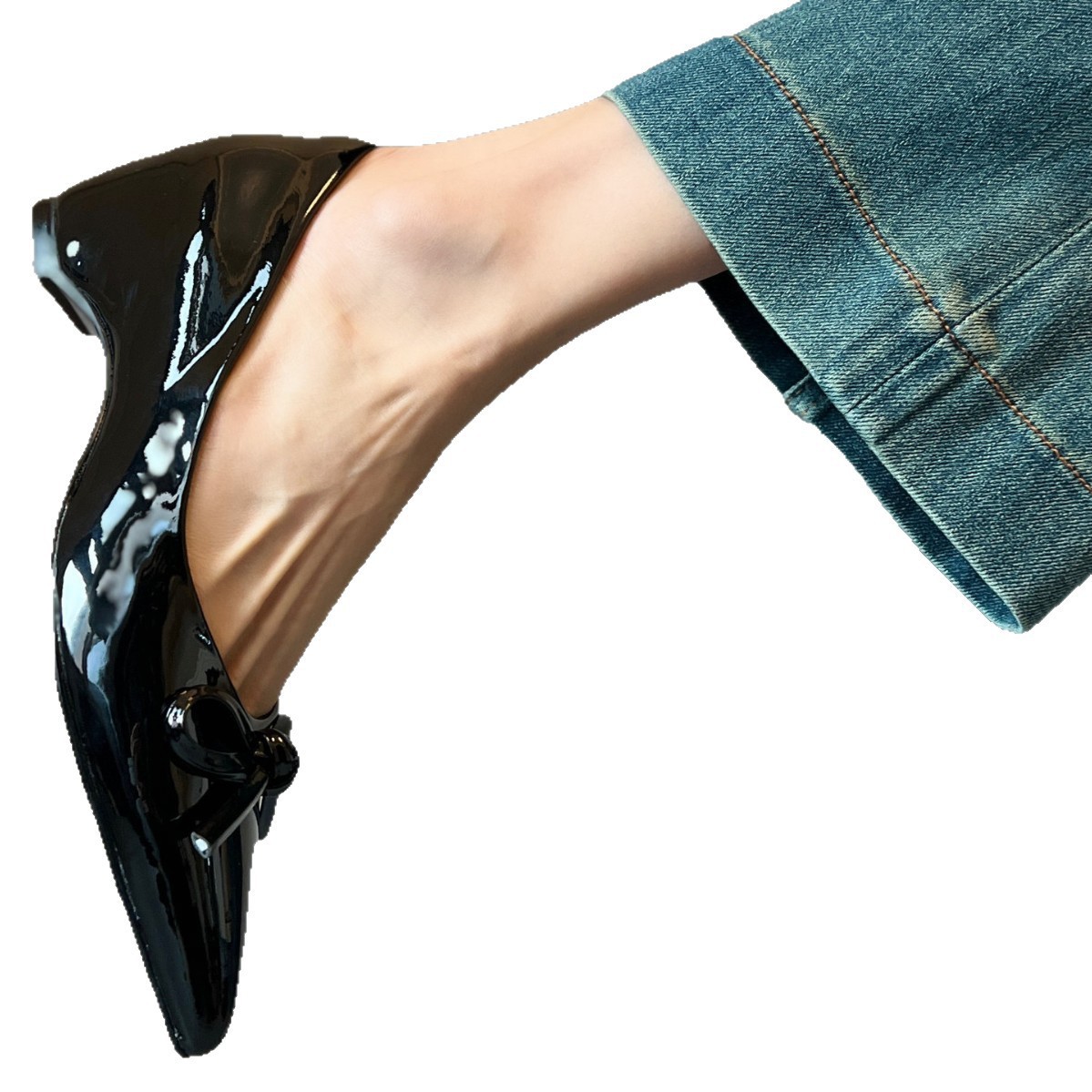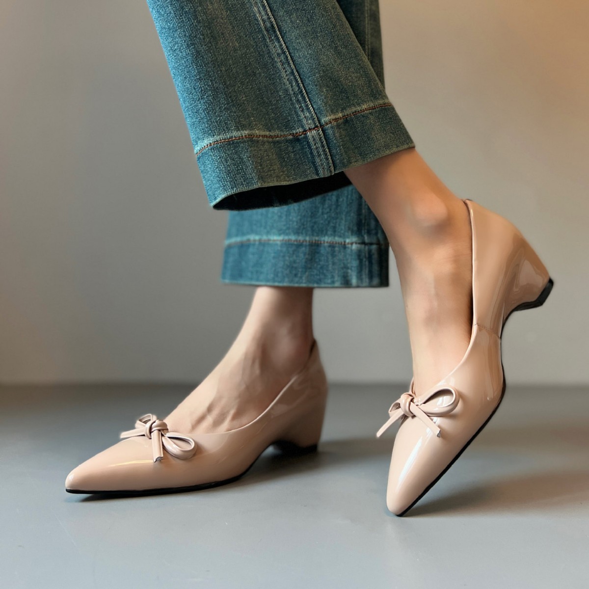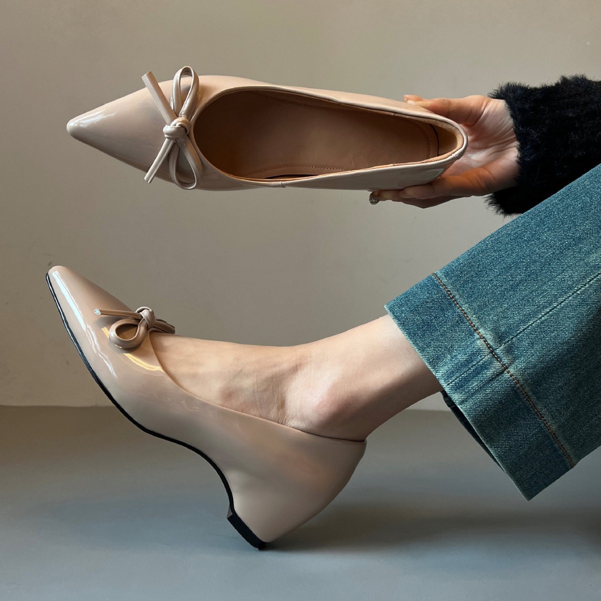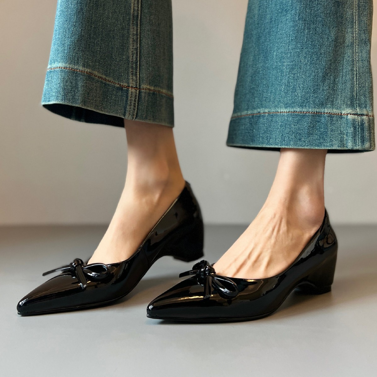 内增高尖头单鞋漆皮蝴蝶结浅口通勤皮鞋女一脚蹬新款气质百搭软底