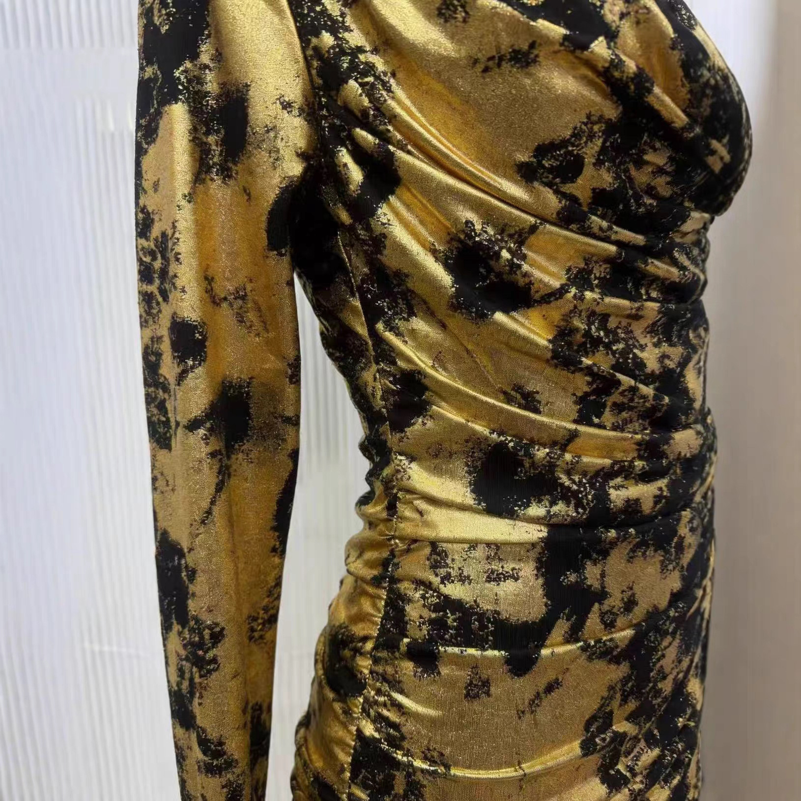 亚马逊爆款2026春季新品修身弹力烫金v领长袖连衣裙