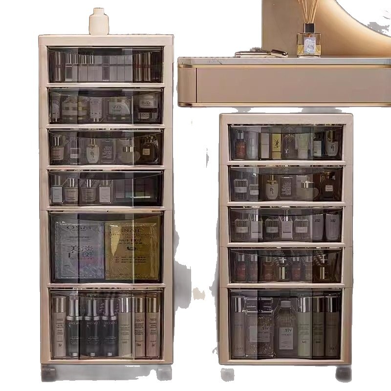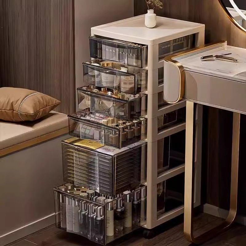 尺寸 | 五层高款【可放高瓶】带滑轮-【珍珠白框+茶透抽屉】免安装/到货即用 | | 尺寸 | 四层矮款-带滑轮-【珍珠白框+茶透抽屉】免安装/到货即用 |