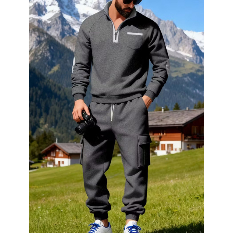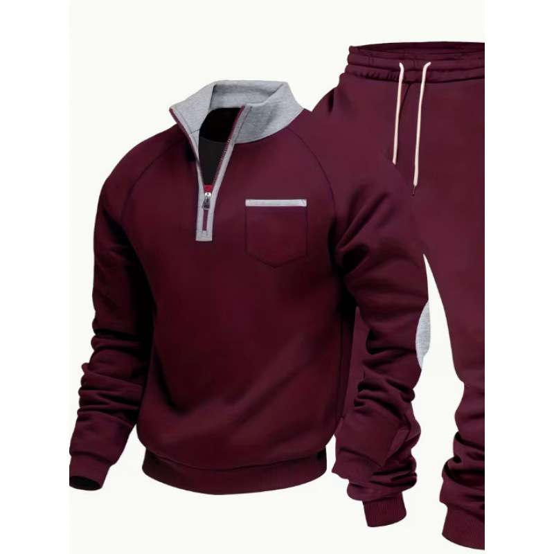 跨境亚马逊冬季男士加绒立领半拉链撞色运动休闲宽松重磅长袖卫衣