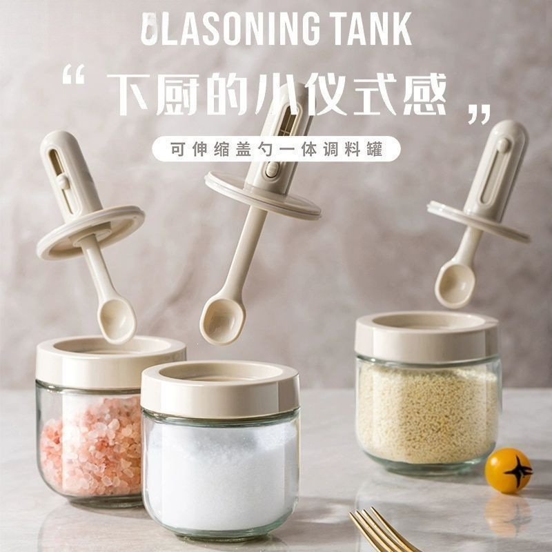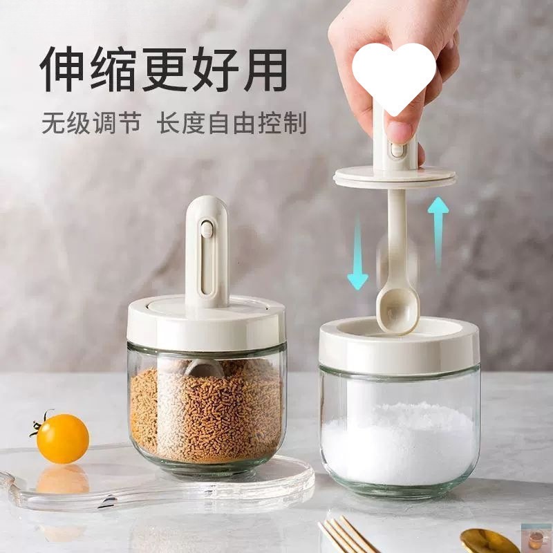厨房调料瓶味精家用密封伸缩玻璃新款盐罐调味一体防潮勺调料罐组